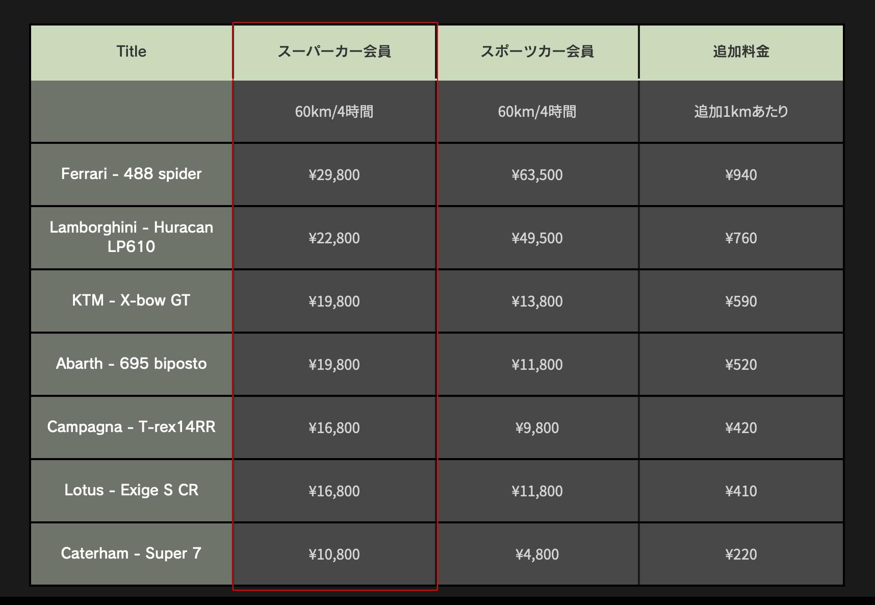 ↓こちらは、スーパーカーの短時間使用(4時間分)のスポット料金表です