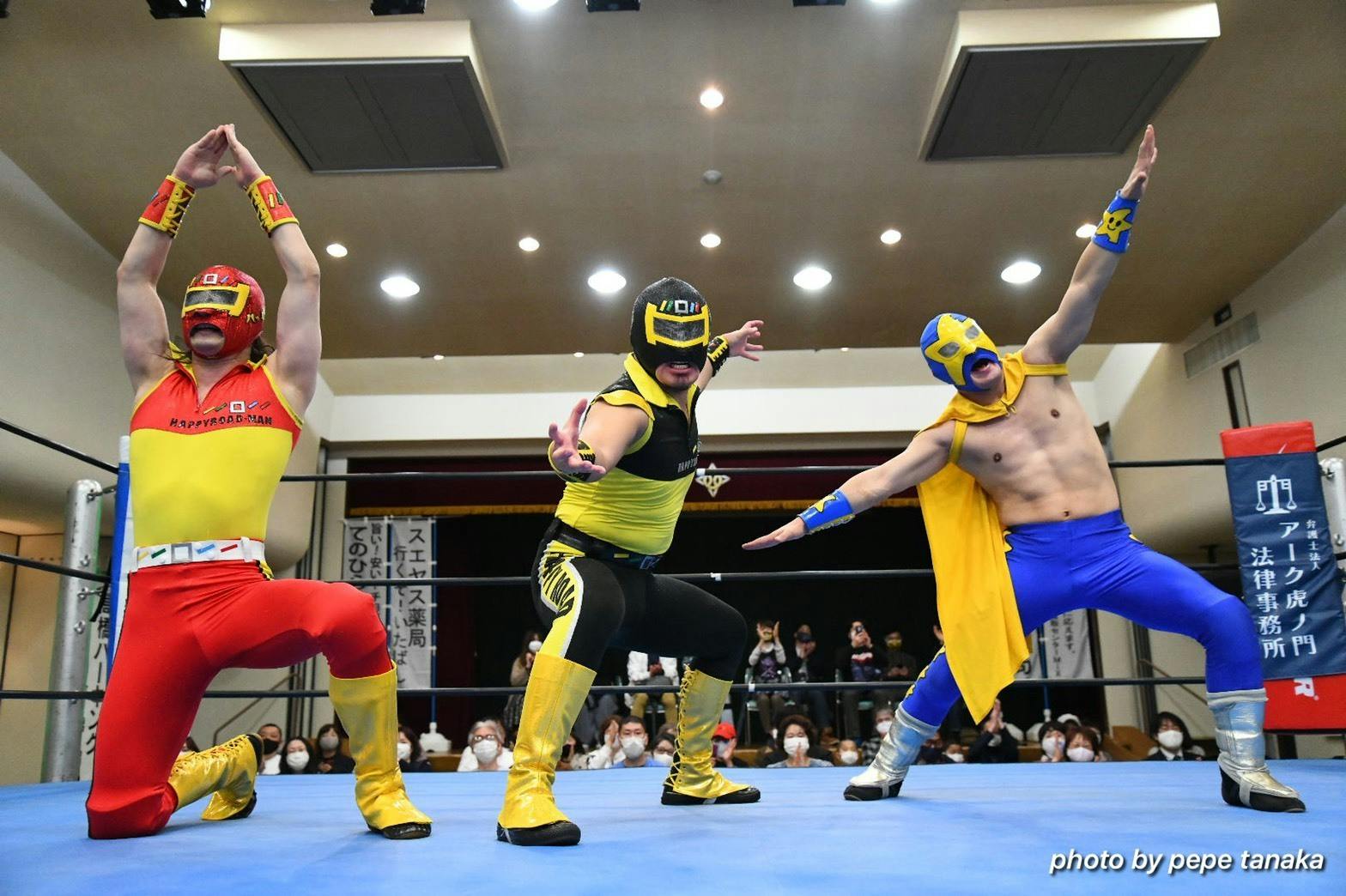 敵味方関係なくまとめて逆エビ固めに入るハッピーロードマン・ダーク