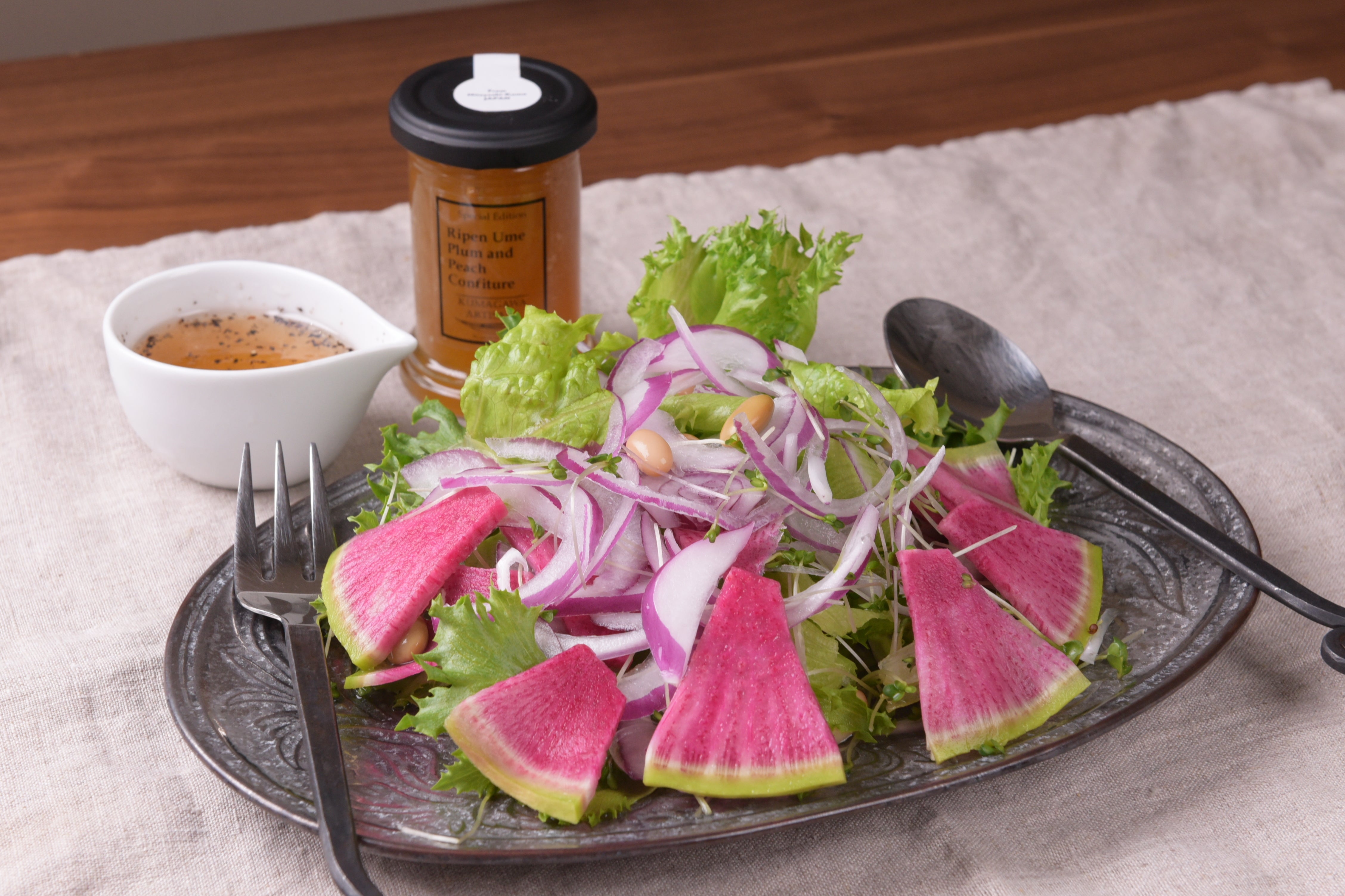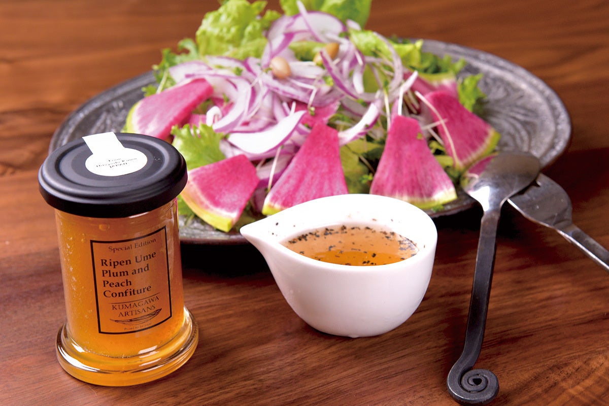 こちらのコンフィチュールは、サラダのドレッシングベースとしてもご活用いただけます。梅と桃の華やかな風味が野菜の美味しさを引き立てます。