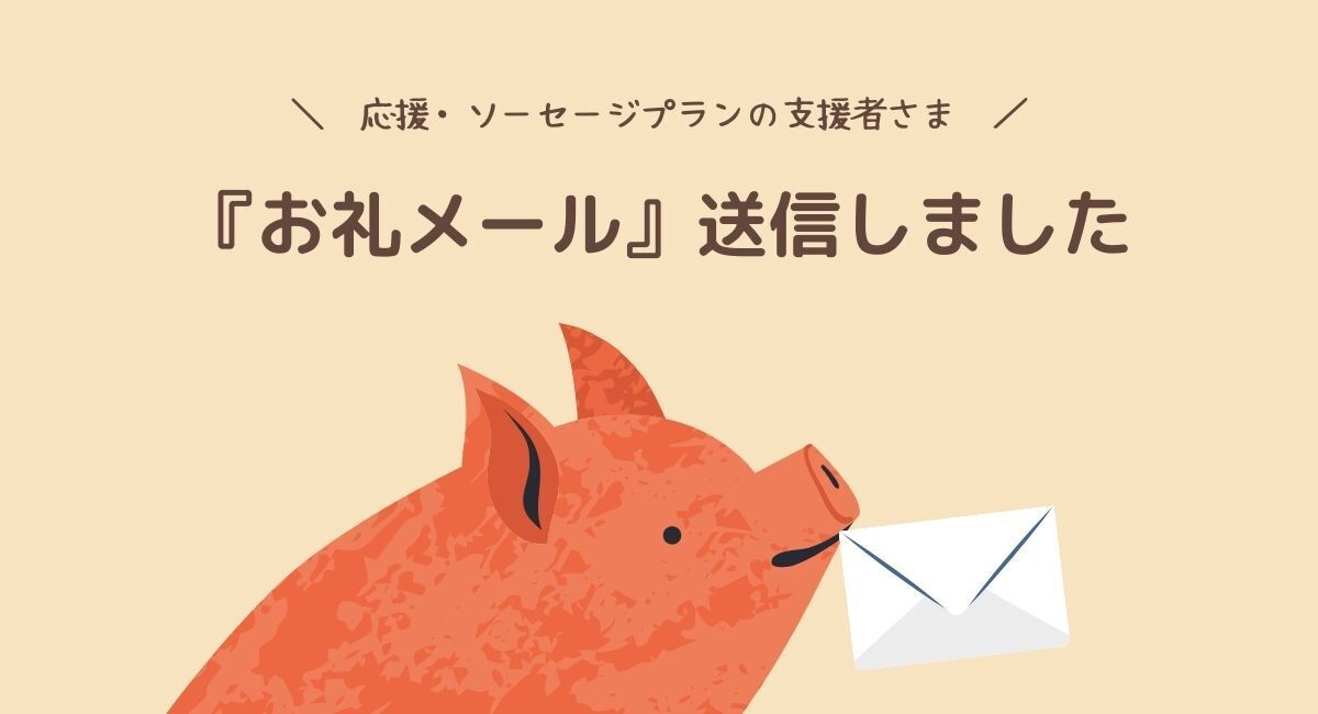 こんにちは。Lyactの古賀です。本日【応援プラン】【ソーセージプラン】【贅沢ソーセージプラン】の支援者さま33名に、お礼のメールを送信いたしました!メール本文にはお礼だけでなく、他のリターンについてのご案内もさせていただいておりますので、ご確認をよろしくお願いいたします。また、上記3プラン以外のすべての支援者さまに関しましては、現在リターンである『成長日記』用のfacebook限定グループを準備中です!グループ準備が整いましたら、『お礼+グループ招待メール』を送信する予定ですので、今しばらくお待ちください!今後ともどうぞよろしくお願いいたします!