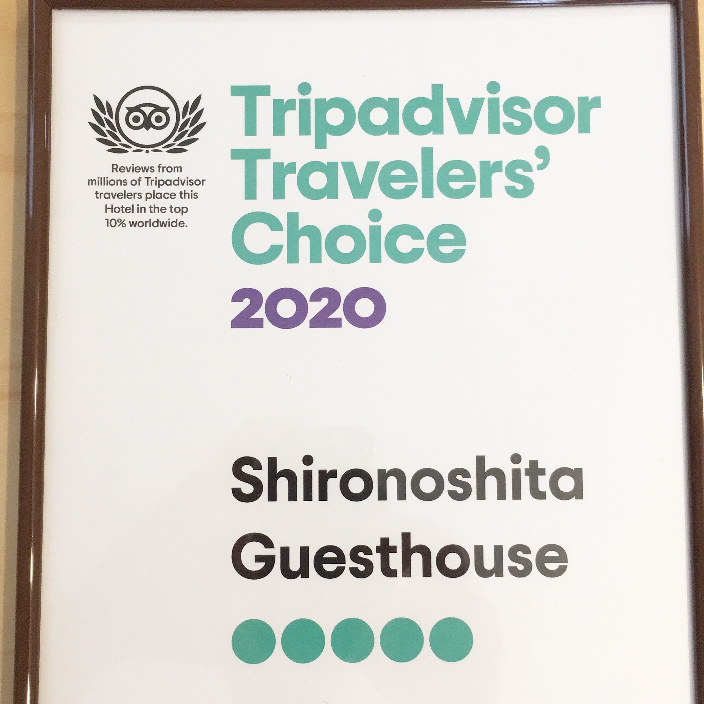 また、お客様方のあたたかいレビューのお陰で、上位10%の宿泊施設に与えられる、トリップアドバイザーのトラベラーズチョイス2020を受賞する事が出来ました。オープン時より欲しかった賞でしたので、受賞のご連絡を頂いたときはとても嬉しかったです。