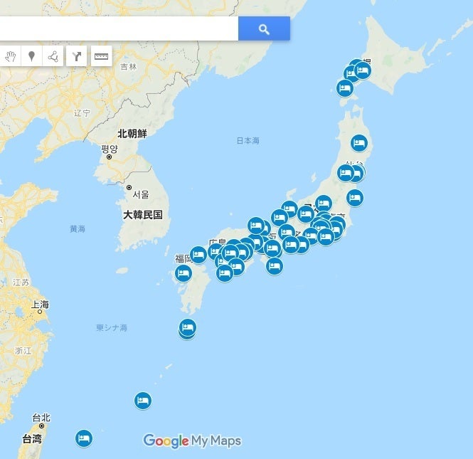 (コチラ)、この状態では各宿の場所が分かりづらいので、地図版を作りました。Googleのアカウントがないと閲覧出来ない様ですので、あらかじめご了承下さいませ。
