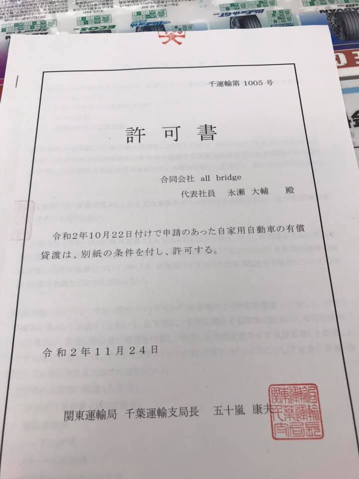 現在、レンタカーの許可は令和2年11月24日に申請できました。