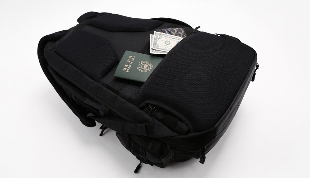 フロントポケットは携帯電話やパスポートの収納を想定し構成されています。