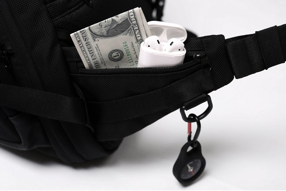背面下部に隠しポケットがあります。背面下部 左右のチャックに収納式のウエストストラップが内蔵されています。