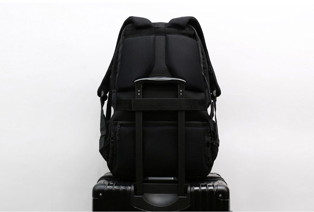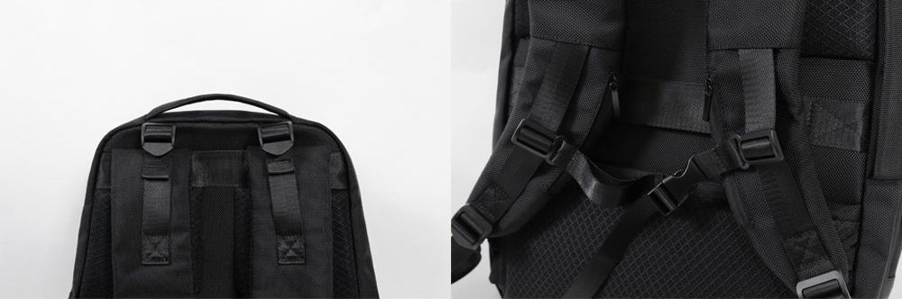→プライムバックパックは背面部エアメッシュが立体構造になっておりクッション性に優れ、通気性にも優れています。各ストラップはユーザの体型に合わせた調整が可能で、背中全体で背負うことにより肩の疲労感を軽減します。