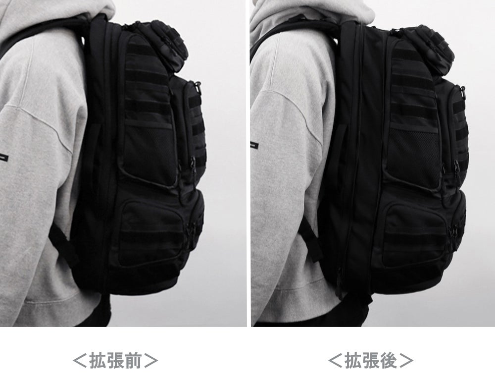 本体側面のファスナーを開くと容量が拡張され、10Lの容量を追加で収納することができます。