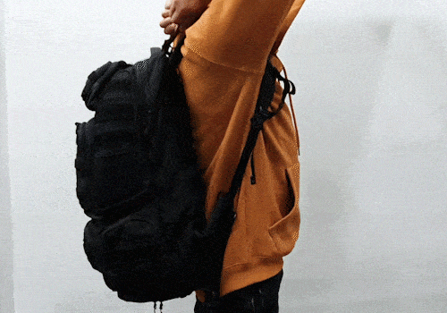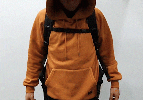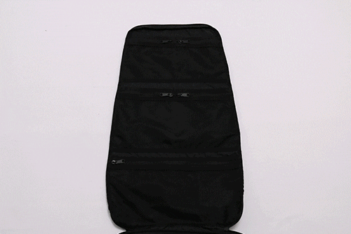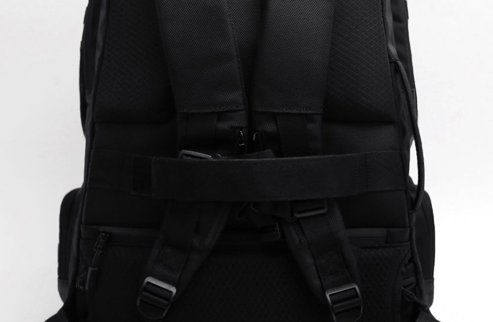 また、背面下部 左右のチャックに収納式のウエストストラップが内蔵されており、そちらを装着することで、背中全体で背負うことにより肩の疲労感を軽減します。