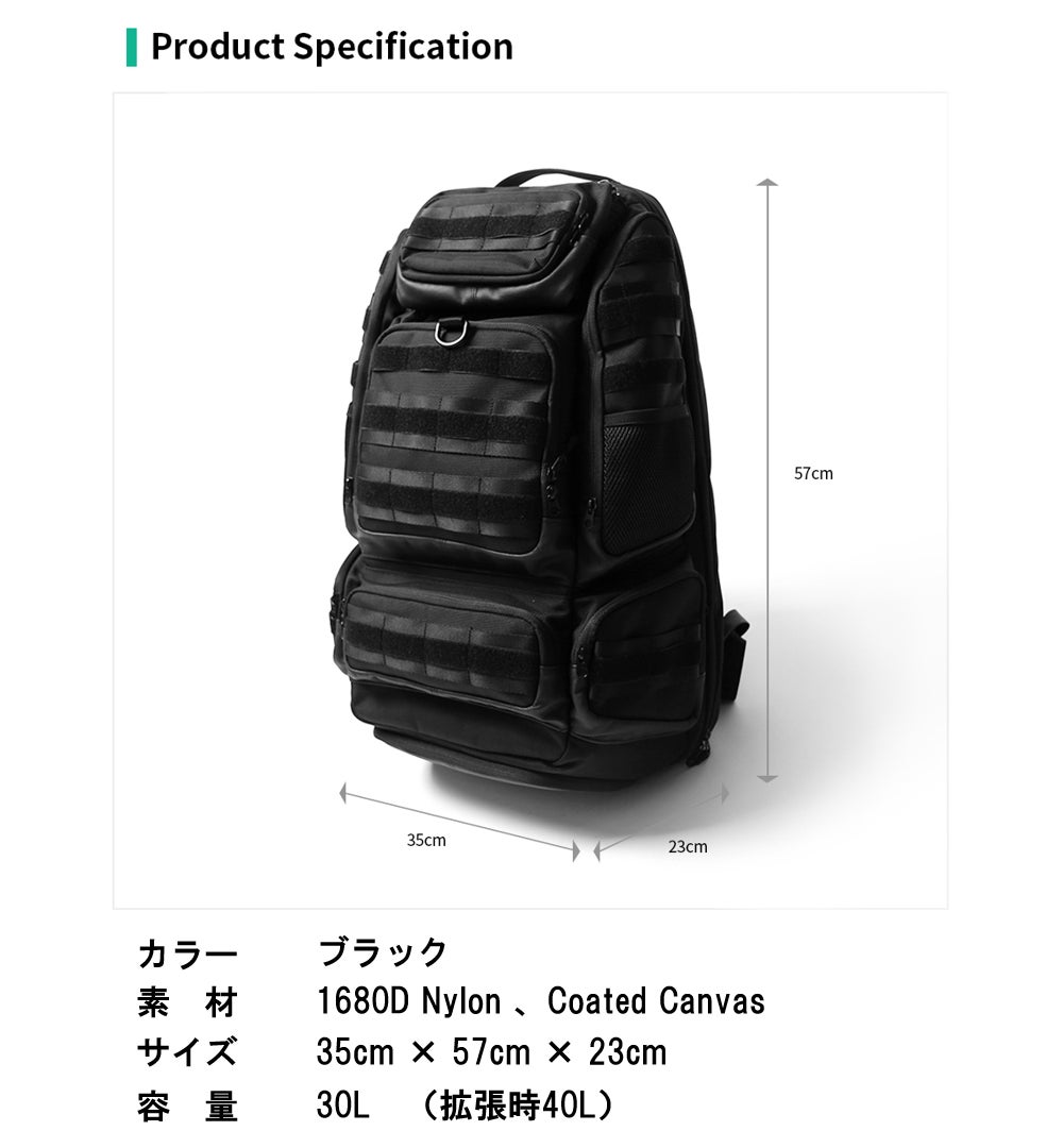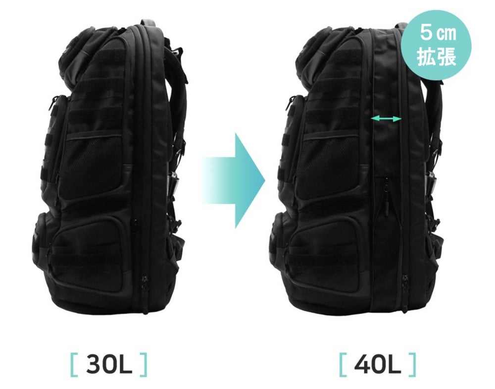 →プライムバックパックは 容量を30Lから40Lへ拡張可能です。急な荷物の増加にも対応可能です。
