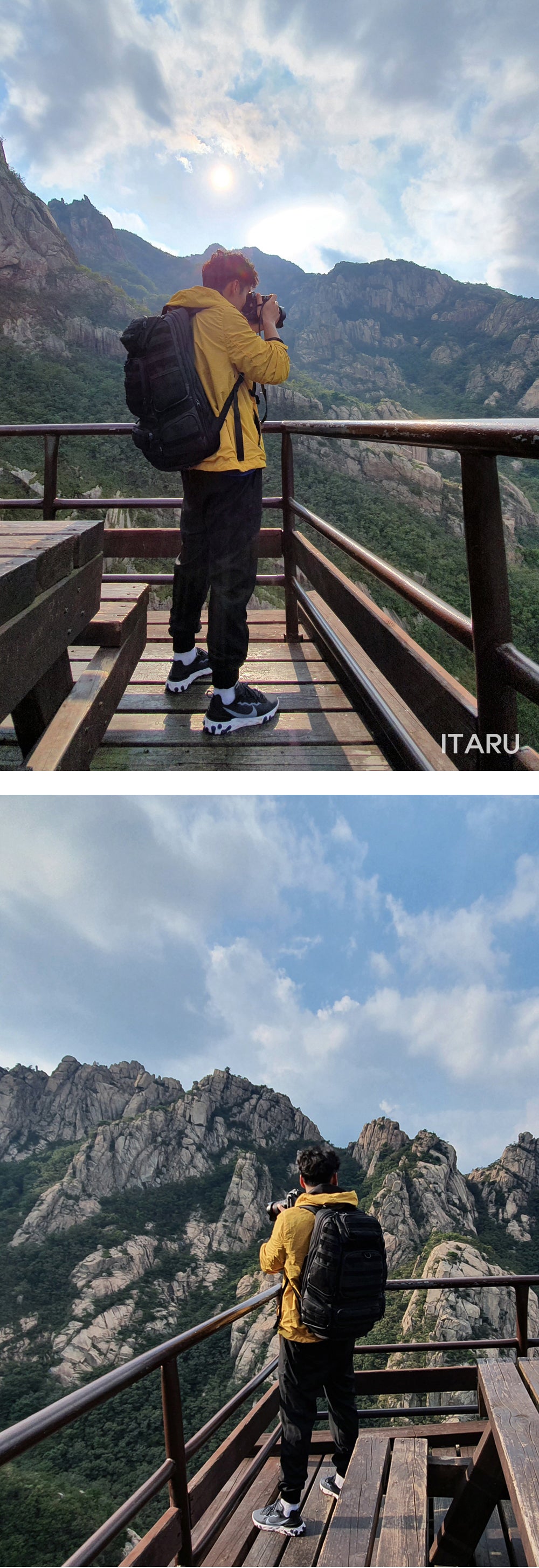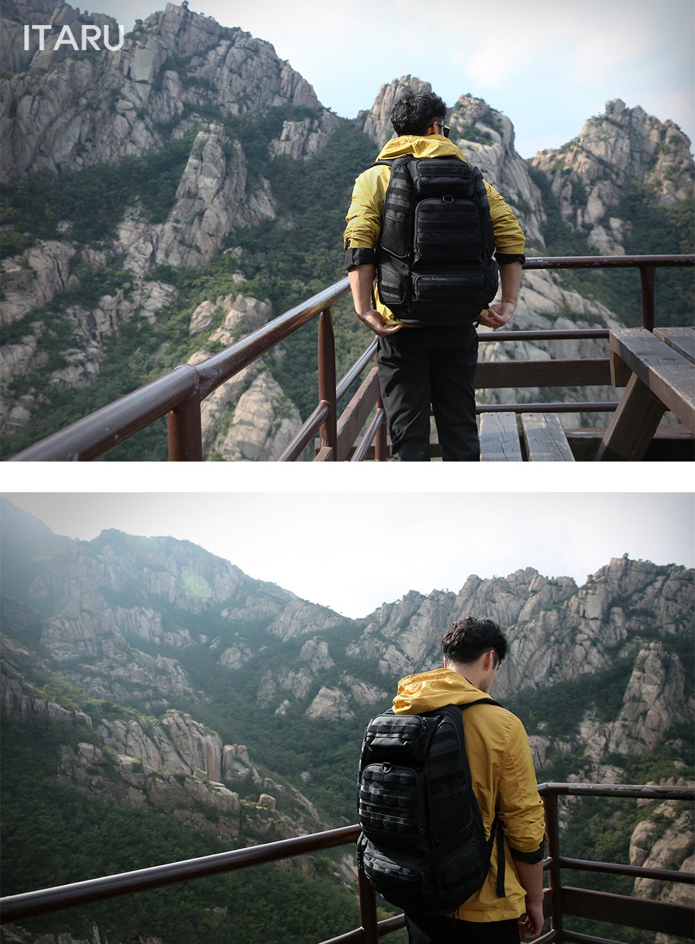 メインバックパックの上部に50度の斜面を与え設計することにより、ウエストバック結合の際にも、一つのバックパックに見えるシルエットを完成させました。