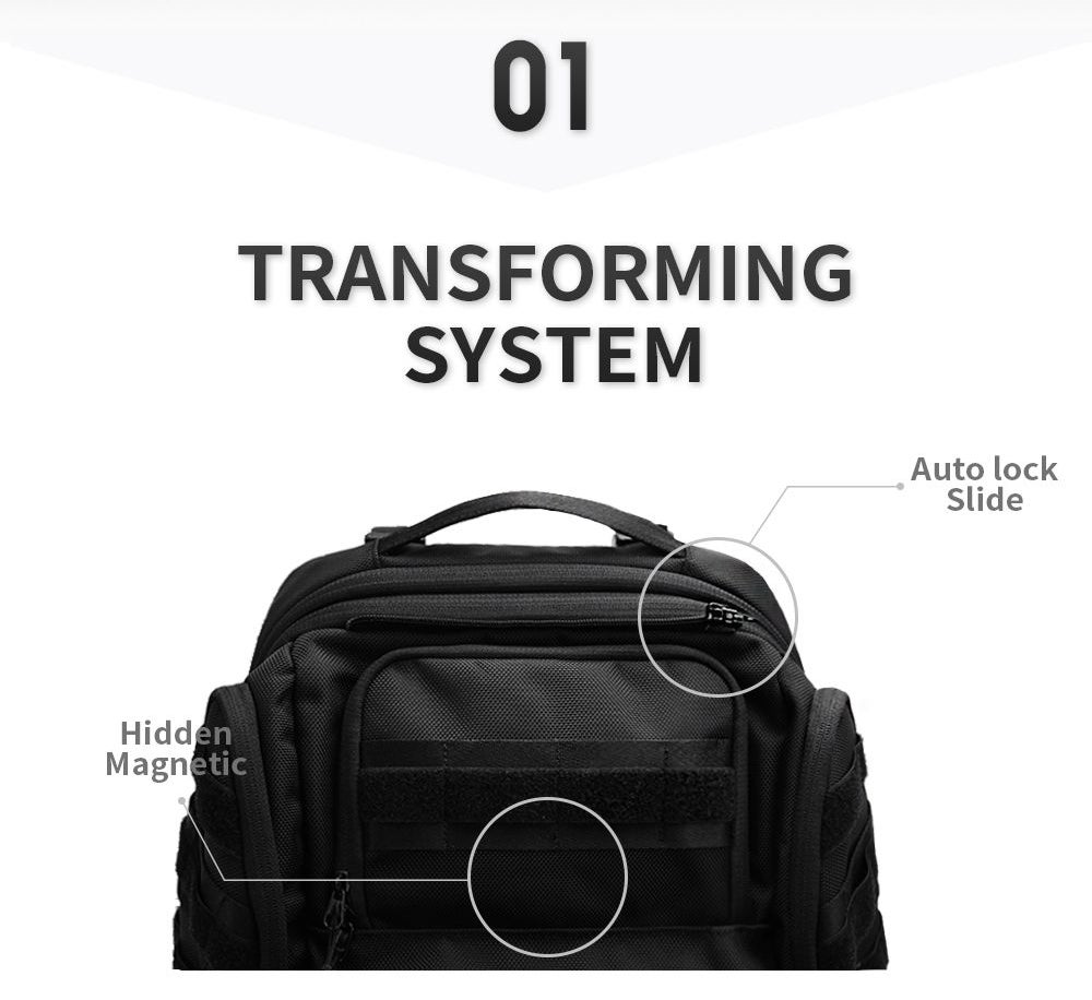 プライムパックとウエストバックとの結合方式は、ジッパーが自然に分離されないAuto Lockスライドシステムを採用しており、安定した結合構造を実現しております。