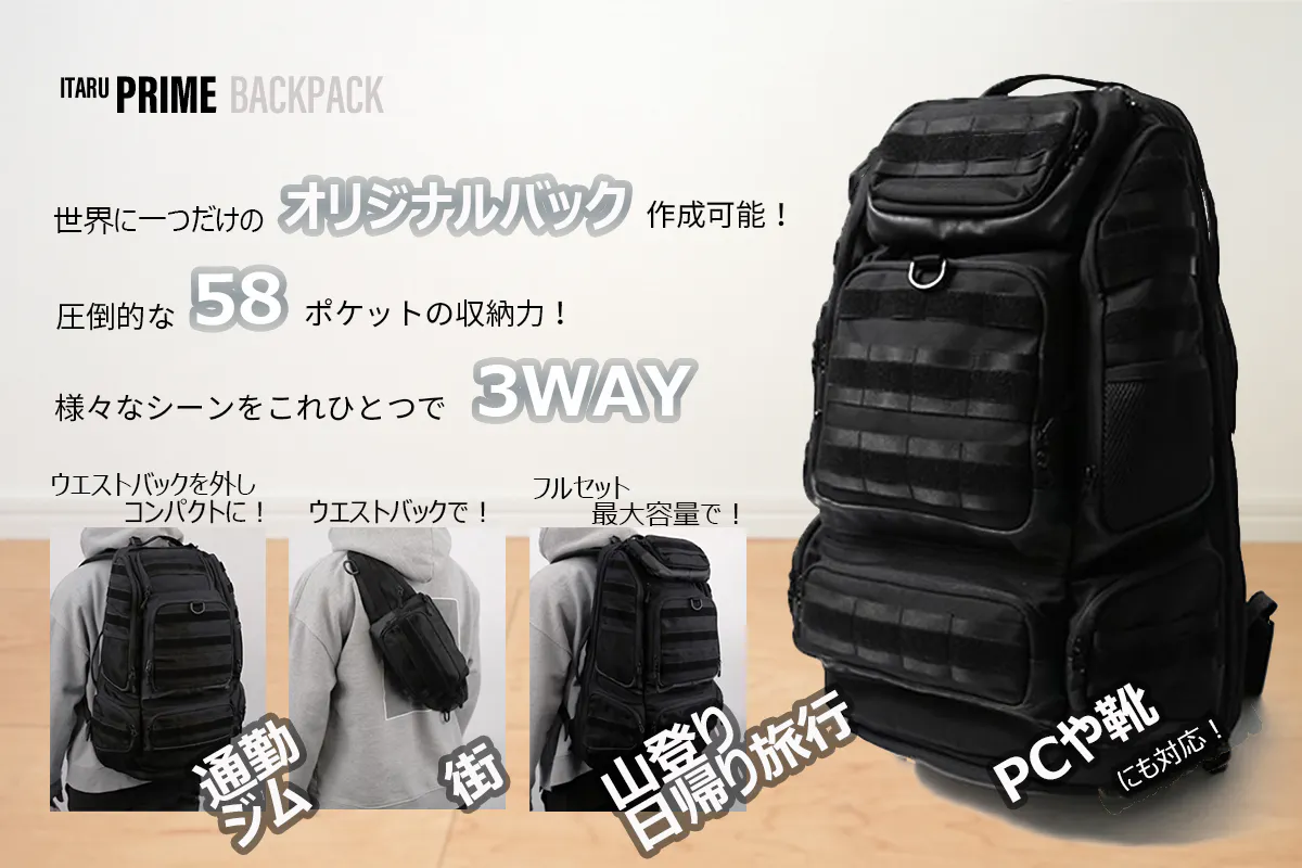 →プライムバックパックは ウエストバックを取り外せるため、通勤通学では、軽量コンパクトに本体だけで!街での買い物はおしゃれにウェストバッグだけで!日帰り旅行ではスーツケース代わりに、合体させて容量も拡張して大容量で!と、様々なシーンをこれひとつでご利用いただけるように設計されています。