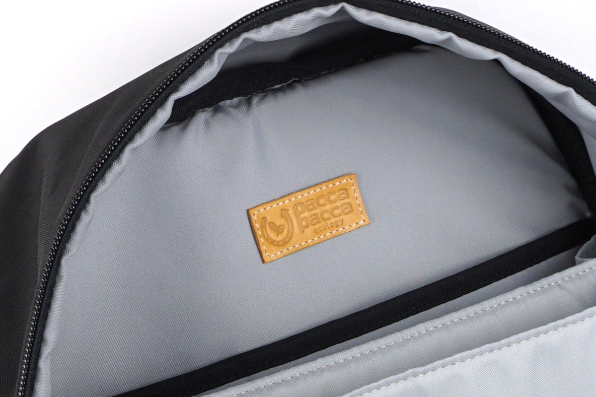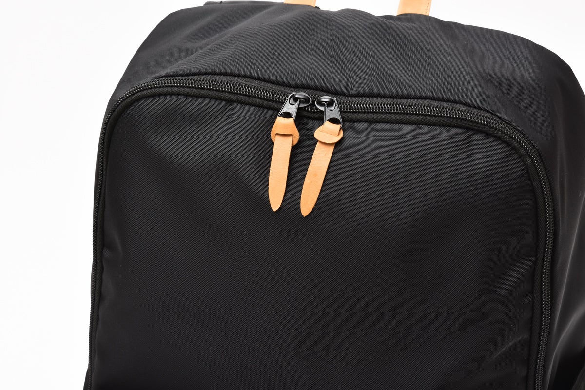 外装は、高密CORDURA® ECO 撥水加工を施したリサイクル素材です。製造過程でのエネルギー消費量や原料消費量を押さえている環境にやさしいエコ素材を使っています。スライダーの引き手部分には端材を使用。捨てられてしまう素材をここに活用することで、素材を無駄にせず、活かしていくように心がけています。