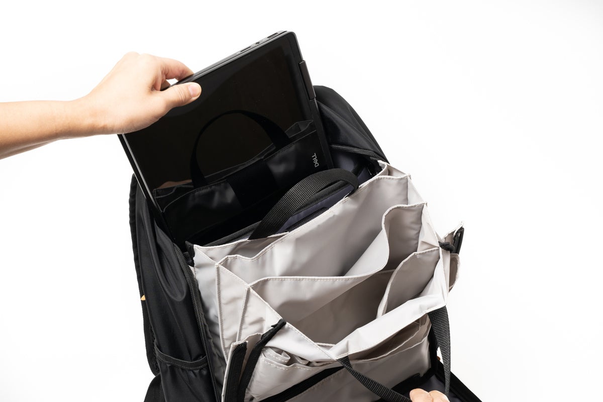 荷物が迷子にならずスッキリ収納内装の仕切りにもそれぞれに仕切りポケットを付け、マウスやペン、メモ帳など用途に合わせて収納いただけます。