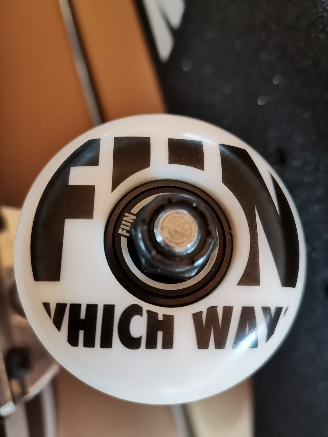 タイヤの中心の部分、白線に白文字「FUN」って書いてある部分のパーツです。スケボーの走りに大きく関係する「回転」の肝となる重要なパーツです。