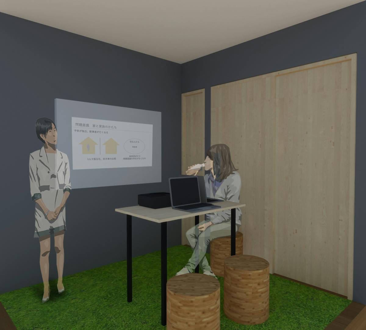 部屋の雰囲気といたしましては床全面に人工芝を敷いて、場合に合わせて普通にみんな席についてホワイトボードやプロジェクタを使いながら企画・ミーティングしたり、地面に胡坐をかいて企画・ミーティングできるような少し遊び心のある空間を目指しております!