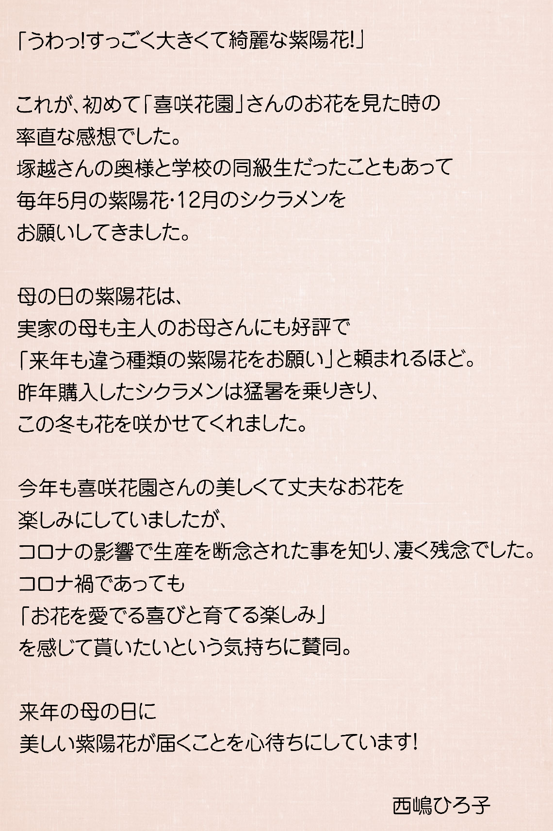 2021/02/28 10:08こんにちは!喜咲花園の園主、塚越 誠です。毎度、毎度ご無沙汰しております。今回、クラウドファンディングを行い、考えられないほど沢山の方々にシェアされ、非常に沢山の方々に心配していただき、沢山の方々にご支援を賜り、本当に感謝しています。いよいよ本日が最終日となりました。目標金額には遥か届きませんが、皆様の気持ちが嬉しくて、沢山の方々から後押しをしていただき諦めていたシクラメンももう一度育ててみようかと思っているところでございます。園芸農家をはじめて約20年、下仁田町で独立し8年を迎えました。雪害やコロナの影響で沢山の方々にご心配をお掛けし、何度も気持ちが倒れそうになっても支えてくださり今があります。昨シーズンは思いを込めて育てた花をコロナの影響で届けることさえできませんでした。現在もなお生活環境は窮屈な状況が続いており、なかなか外出できる状況ではありませんね。しかし、私どもは今年の母の日を、去年のような寂しい母の日にはしたくないと思っています。贈った人も贈られた人も 心を癒して笑顔にしてくれる花を全国の人に知ってもらい、届けたい。処分なんかしたくない。と言う気持ちからクラウドファンディングのプロジェクトを開始しました。喜咲花園だけが特別被害にあってる訳ではありません。影響出ている事業は測り知れず、花の同業者や関連会社も皆影響し、市場でさえ廃業しているところもあります。なので、プロジェクトがシェアされたことで、今年の母の日には、また花を贈ろうかな!とか、今までは花じゃなかったけど、今年は花を贈ろう!とか、あわよくば、今年は喜咲花園のあじさいを贈ろう!思って戴けるだけでも嬉しいのです。伝統製法は有りませんが、愛情管理は365日欠かすことなく行っています。贈っても贈られても、飾って恥ずかしくない状態の良い花にラベルを付けて出荷しています。全国配送も承っています。どうか、今年の母の日は大切な人に是非、気に入った花を贈って頂けたらと思います。このプロジェクトを助言、協力してくださった方々から繋いで頂いた、人の繋がりから素敵なコラボも実現しそうで感謝しております。また、プロジェクトが終了後も発信していきたいと思います。今後も引き続き喜咲花園をご支援賜りたく存じます。 感謝感謝です。 塚越 誠 もっと見る