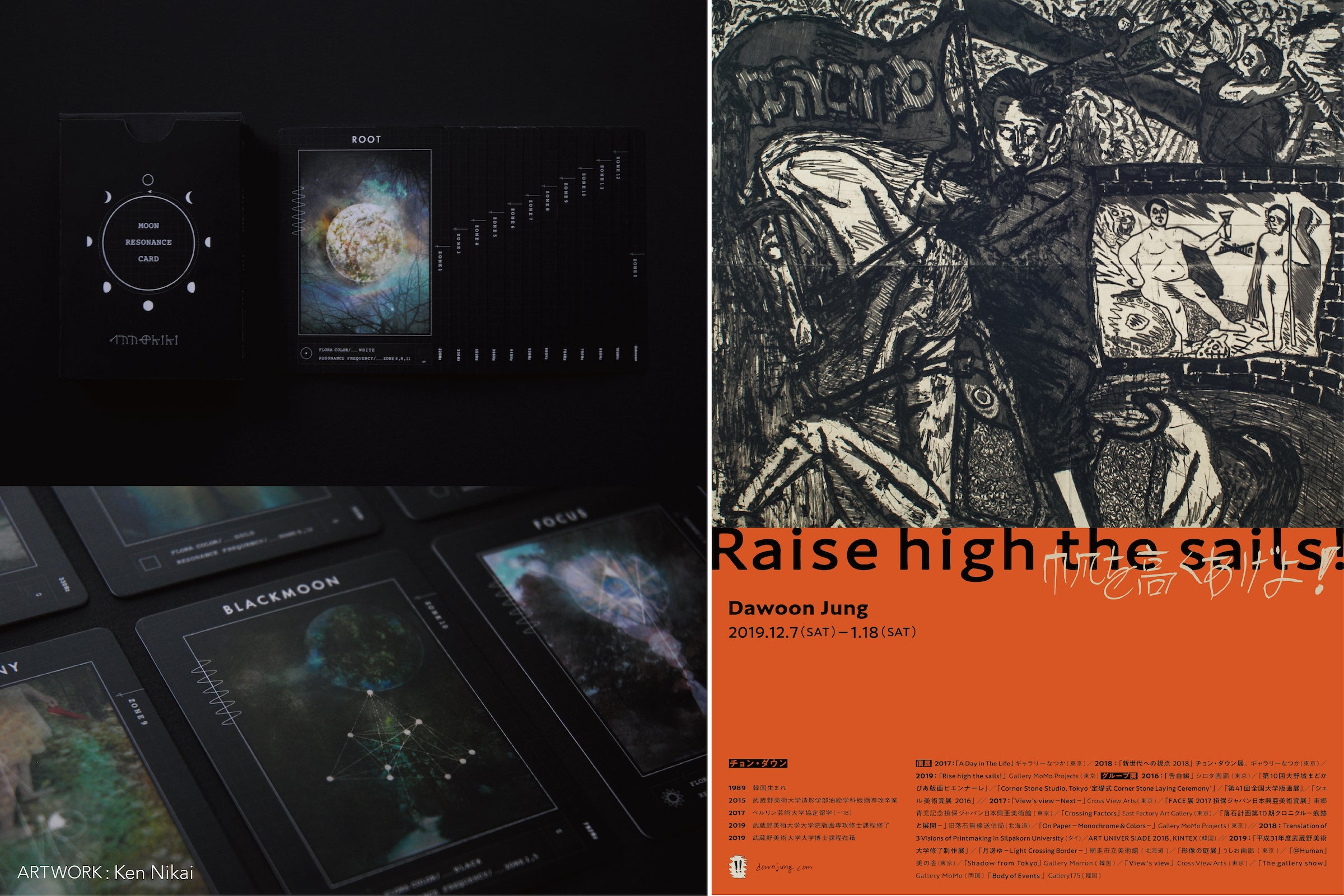 左:リーディングカード「Moon Resonance Card」/右:チョンダウン個展「帆を高くあげよ!」リーフレット