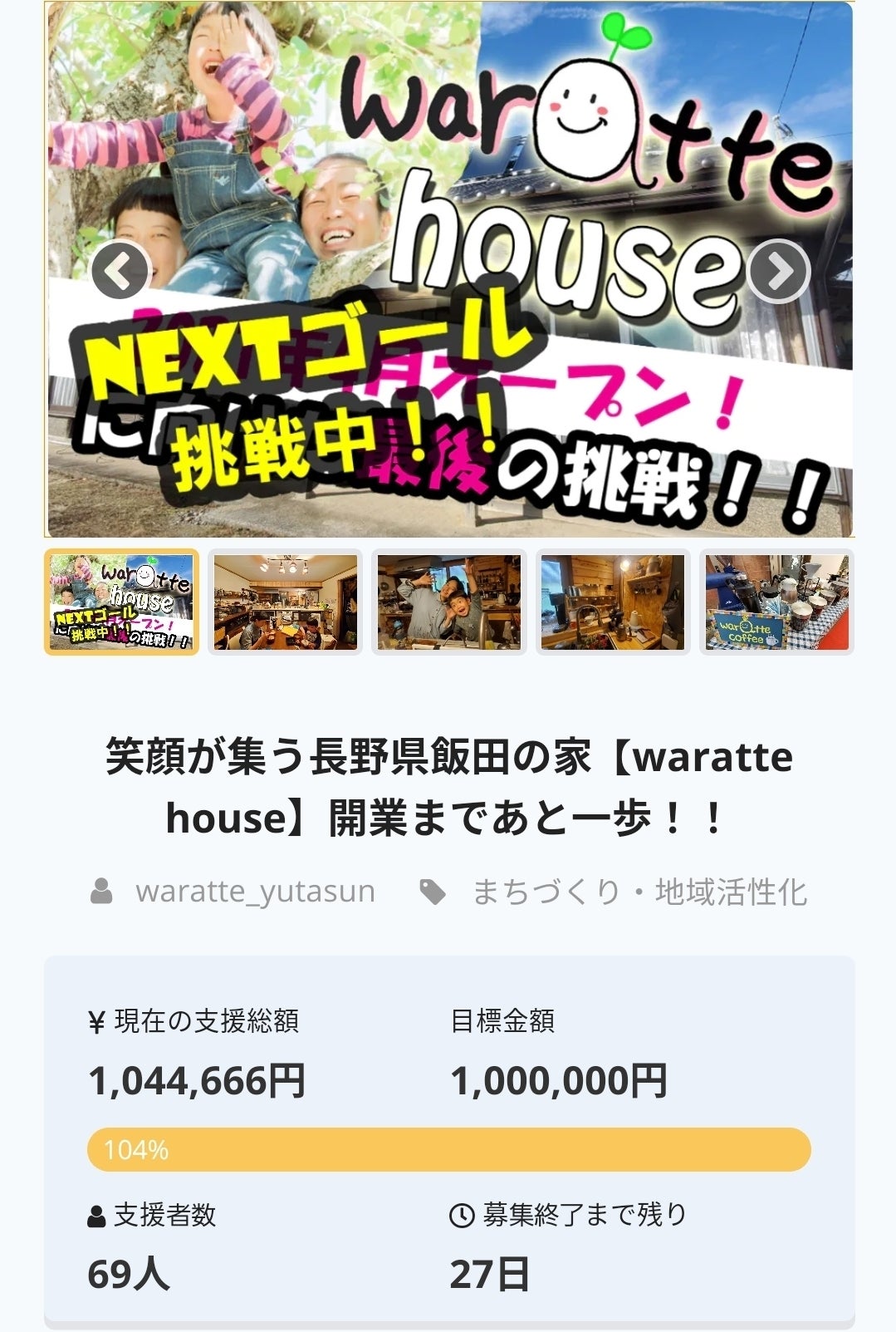 2020/11/30 20:17支援、応援頂いた皆さんのおかげで僅か10日目でファーストゴール達成しました(TдT)(TдT)まずは、心からの感謝をお伝えします!ありがとうございますm(_ _)mそして、妻の出産予定日も10日を過ぎた今日奇跡的に入院直前に陣痛が来て助産院での出産ができる可能性がぐっと高まりました!!まだ産まれておりませんが今しばらく、ご報告お待ち下さい!!無事に出産を終え次第ネクストゴールに向けて活動再開致します!どうぞ最後までお付き合いのほどよろしくお願い致しますm(_ _)mwaratte 杉山 豊・愛 もっと見る