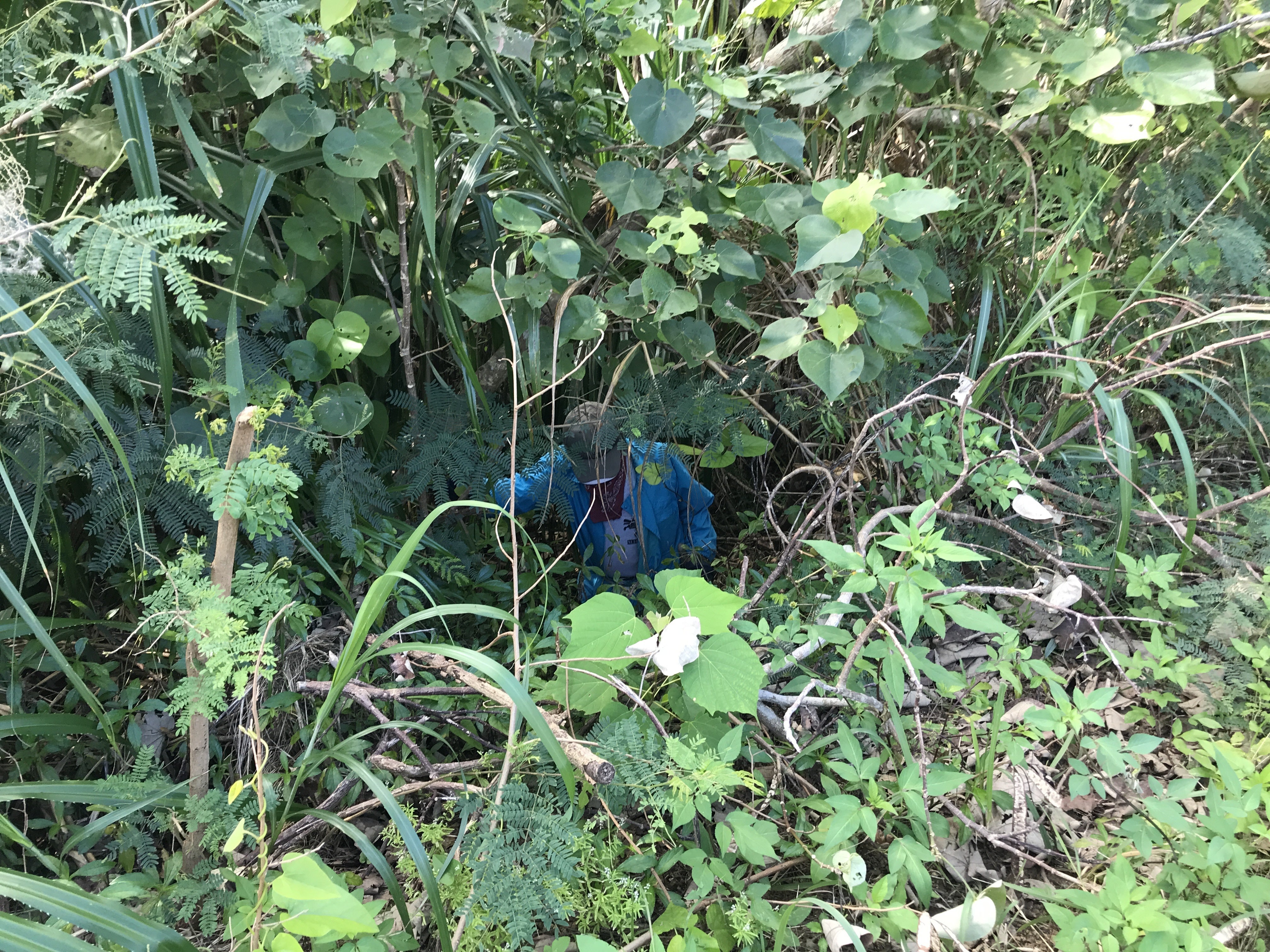 The Taketomi Town, Ministry of Environment rep and I went to check some of these sites. The underpass (not visible) is a little to the right of center in the photo, but we have to be conscious not to make a path from the road to the underpass- so as not to make a new path for the cats straight to the road! Also, if we cut away too many weeds/branches it is possible we might make it less appealing to the cats...it is quite a delicate balance of clearing the underpasses but not too much! We will probably be able to start this maintenance work some time this year. Of course the Yamaneko Patrol members will be assisting in this effort! Despite this being a reconnaissance mission just to asses the situation, our Mr. Hige has his weed cutter in tow! (lol)