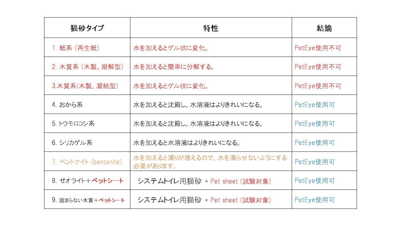 A:水を加えるとゲル状になる紙系の猫砂や木質系の猫砂は使えません。ベントナイトは水が濁らないように注意する必要が有ります。ペットシートにしみ込んだおしっこも測定可能です。