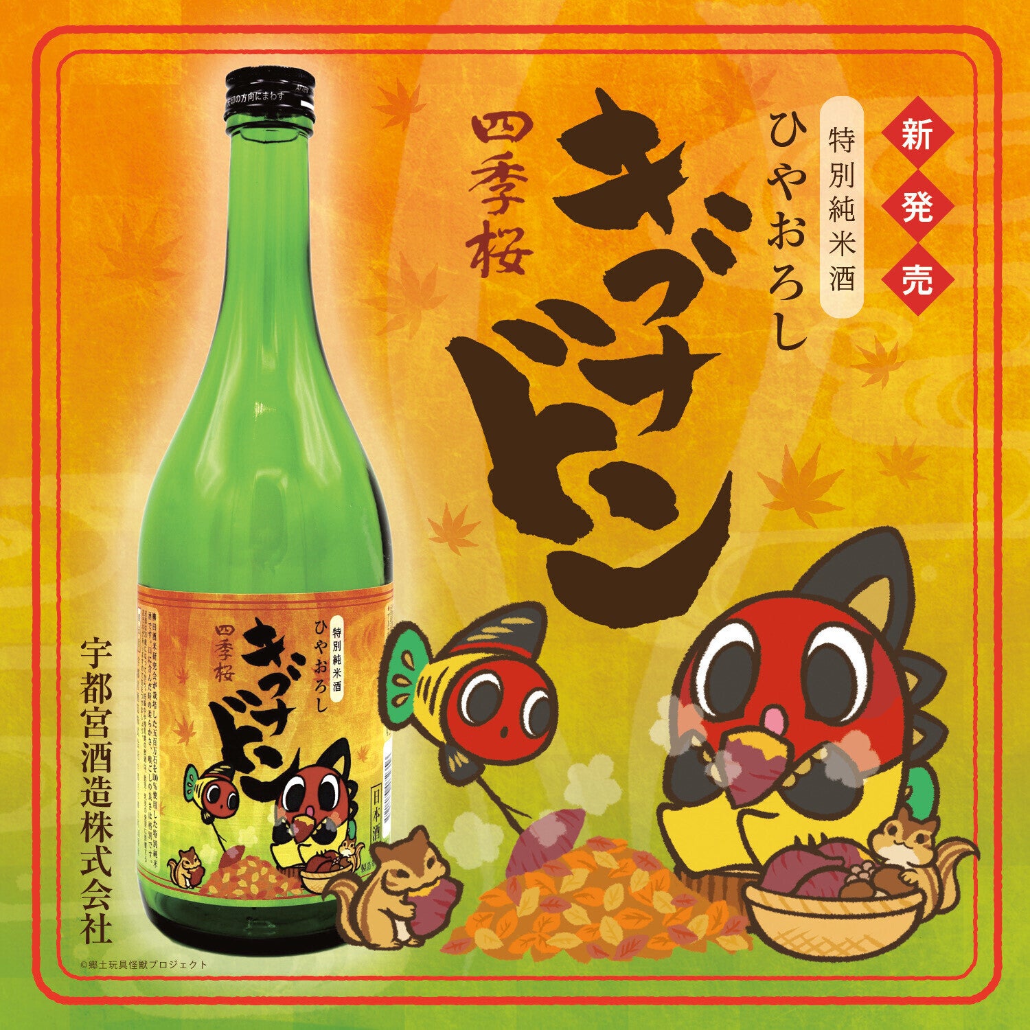 季節が秋に移りゆく中でキブナドン&うおちゃんが、リスさんと一緒に焼き芋を楽しんでいる様子が可愛いラベルです♪