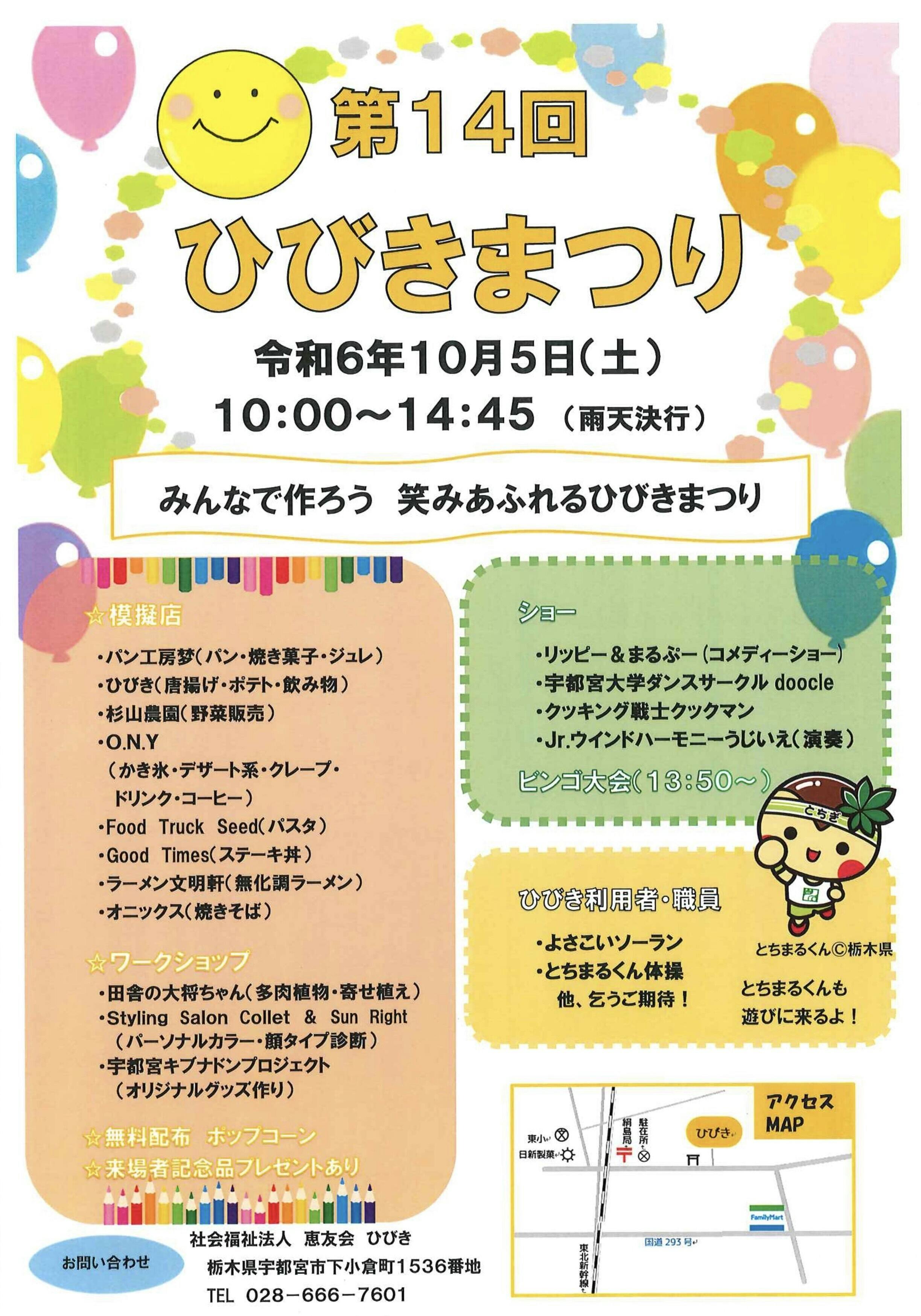 宇都宮市下小倉町にある多機能型施設「ひびき」にて開催される「第14回ひびきまつり」に、宇都宮キブナドンプロジェクト(UKP)も出店いたします☆