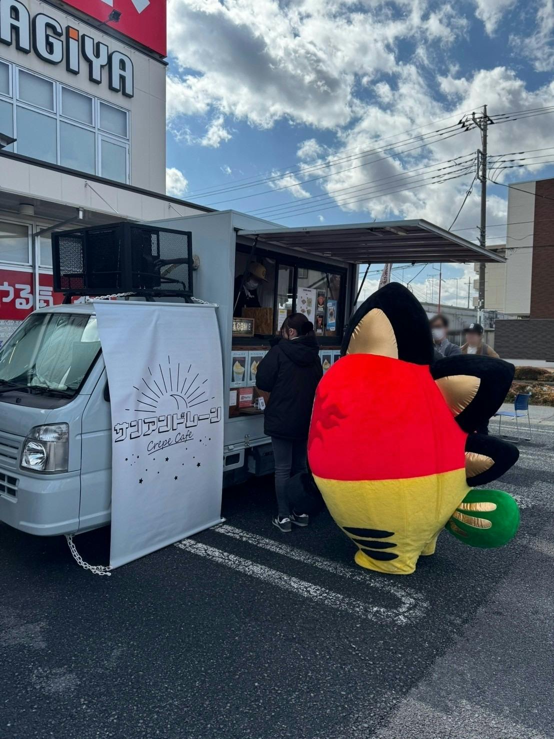 出動中のキブナドン、いつの間にかサンアンドムーンさんのキッチンカーで順番待ちをしていました…!前のお客様に近い、近いよキブナドン!