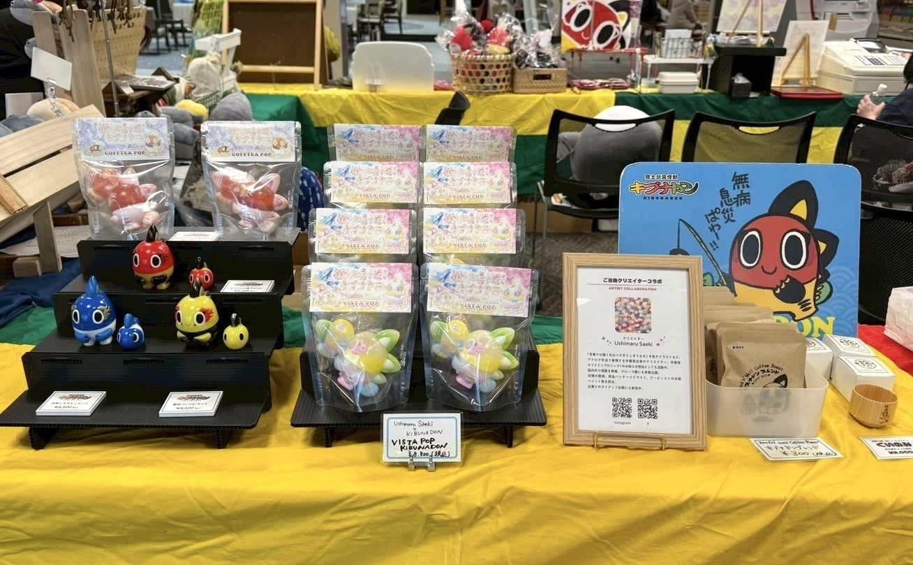 コラボエコバッグをはじめ、まめたさんが作ったサカバンバスピスの「まめぴす」や、マルートさんが作った「まめぴすの巣」黄ぶなカラーver. などが勢揃い!