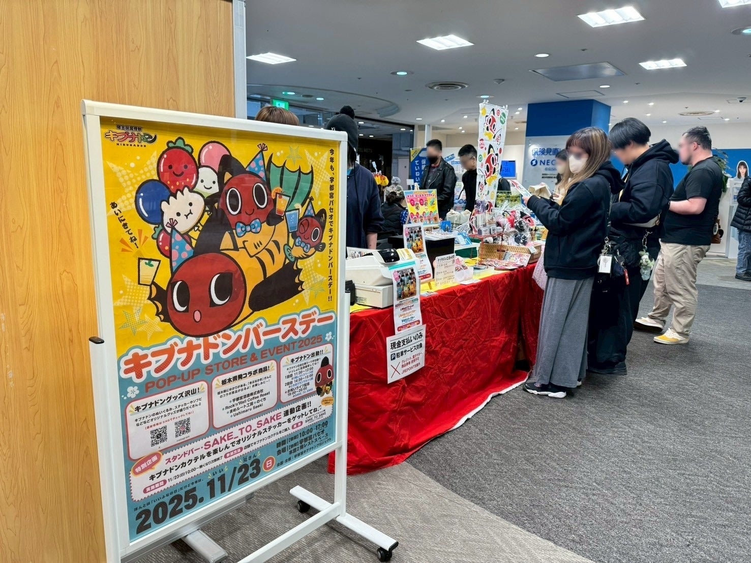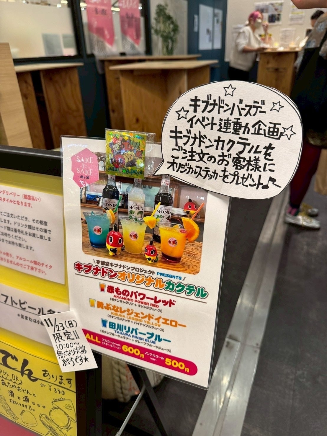 会場にお越しくださったきぶなかまさんには、当日リリースされた素敵なコラボ商品や、新色キブナドン(ソフビ)など限定アイテムをお迎えいただいたり、お祝いライブ配信会場の「SAKE _TO _SAKE POP-UP SHOP」店頭にて「キブナドンカクテル」や先着プレゼントの、限定デザインステッカーをお楽しみいただきました。