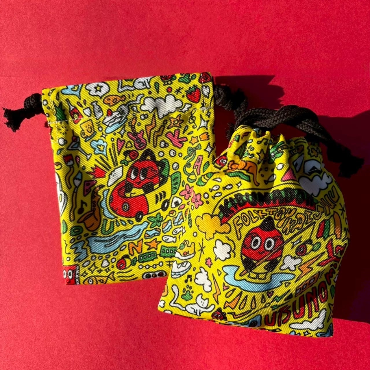 おしゃれなオリジナルグッズがSo cute! な、デザイナー・のぐちさんコーナー♪ Gyozaくん(ソフビ)もお店番★デザイナー・のぐち × キブナドンのコラボ巾着! イラストで表現したUKPのイメージを、ぎゅっと詰めたポップなデザインに仕上げてくださいました☆