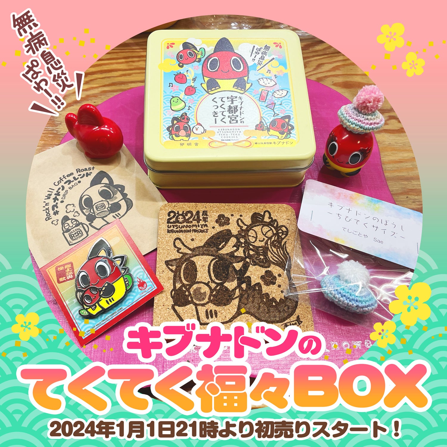 こんにちは☆黄ぶなが大好き”きぶなかま”お知らせ担当です♪2023年も残り僅かとなりました。キブナドンの故郷・宇都宮では、すでに餅つきのご準備をされているご家庭をお見かけするので、年末だなぁと感じるこの頃です。UKPは、今年も栃木・宇都宮からの応援発信を、キブナドンと一緒にぱわーいっぱいに行う事ができました♪各イベントにお立ち寄りくださった皆様、活動にお力添えくださった皆様には、感謝の気持ちでいっぱいです。その気持ちをぎゅ〜っと詰め、年明けに向け、てくてくハッピーなお知らせです!UKPの初売り‼【 キブナドンのてくてく福々BOX 2024 ver. 】 数量限定オンライン販売決定‼‼きぶなかまの皆様にハッピーな2024年をお迎えいただくべく、ぱわー満載‼︎今年も栃木生まれのワクワクな宇都宮限定アイテムをぎゅっと詰めた「キブナドンのてくてく福々BOX」を準備いたしました☆オンラインショップ【キブナドンてくてく商店】にて、数量限定販売をいたしますので、皆様、是非この機会にお迎えくださいね♪通販は、1月1日(日)の21時から、3日間限定でオープンいたします!【キブナドンのてくてく福々BOX 2024 ver. 】5,500円(税込・送料込)■福々アイテム内容 7点■・2024年 年賀状・2024年限定コースター・キブナドンの宇都宮てくてくクッキー( 卵明舎 & 酵母菓子 雨花 コラボ )・キブナドンブレンド( Rock'n'Wall Coffee Roast コラボ )・キブナドンの帽子~ちびてくサイズ~ ベレー帽ver.(てしごとやSae コラボ)・おみくじうおちゃん・キブナドン&うおちゃんピンバッジ「キブナドンのてくてく福々BOX」のラインナップはこちら!(写真は開発中のものです)※VAGのキブナドンはつきません。「2024年 年賀状」デザイナー・照紗描きおろしイラストの年賀状で新年のご挨拶♪ 無病息災ぱわー!の気持ちを込め、皆様へ福をお届けいたします♪(デザインは年明けまでシークレット。お楽しみに♪)「おみくじうおちゃん」キブナドンの先輩 ”黄ぶなのうおちゃん”のおみくじが初登場!So Cool!・THE魔除け!赤ものレッド♪・学業向上!オオルリブルー♪・健康長寿!とちぎグリーン♪以上3種類のカラーのうおちゃんがランダムで皆様の元へ泳ぎに参ります!「2024年限定デザインコースター」来年の干支・辰(龍)に扮したキブナドンとうおちゃんの、2024年ver.福々BOX限定のコースター♫辰は十二支の中で最も縁起の良い干支と言われているそうです。様々な願いを叶えてくれるだけでなく、あらゆる物事をいい方向へ導いてくれる力があるとされているとも云われが。きぶなかまさんがわくわくな辰年のスタートを楽しめます様、願いを込めたコースターです♪「キブナドンの宇都宮てくてくクッキー 限定キブナドンデザイン缶 クリームイエローver.」「日本一の卵」として選定された極上の卵を育まれている、卵明舎さんの卵を使用し、 酵母菓子 雨花 さんに作っていただいた可愛いクッキーが詰まったクッキー缶が福々BOXにも登場です!どのクッキーも、お野菜などで優しい色合いに仕上げていただいております。「誰かの幸せな時間にちょっぴり寄り添えるお菓子をお届けできます様に。」と願う雨花さんのお気持ちが感じられるお菓子です♪小麦とレーズンや小麦から起こした自家製酵母を使い、低温で長時間発酵・熟成させ小麦の旨みを引き出した生地で、一つ一つ丁寧にお菓子を作られている酵母菓子 雨花さん。素朴で優しく、気持ちに寄り添う様な優しい美味しさを味わえる雨花さんのお菓子は、イベントですとスタート直後に買いに伺わないと手に入らない程の人気です。この度は、そんなキブナドンの故郷で誕生する素晴らしいお菓子を皆様にお届けしたい!とお願いし、キブナドンと一緒に素敵なクッキー缶をご準備いただきました⭐︎「キブナドンブレンド(ドリップバッグコーヒー)」きぶなかまさんにはお馴染み⭐︎栃木県の農産直売所”あぜみち”鹿沼店の店内にある珈琲屋「Rock'n' Wall Coffee Roast」(instagram/twitter)さんが作ってくださった、オリジナルの「キブナドンブレンド」♪コロンビアとブラジルのコーヒー豆を使用した、オリジナルブレンドです♪雨花さんが作ってくださった「キブナドンの宇都宮てくてくクッキー」との相性も抜群ですよ〜☆「キブナドンの帽子~ちびてくサイズ~ ベレー帽 ver.」「ちびてく」ことVAGキブナドンたちにぴったりなニット帽が今回も登場!お人形用のニット帽や髪飾り、リメイク着物などを制作する「てしごとやSae」さんの作品は、宇都宮のきぶなかまに大人気なアイテム⭐︎今回は、可愛いベレー帽をご用意いただきました!サイズが合えば、他のお人形さんにもご使用いただけますよ♪どれが来るかはお楽しみに〜!「キブナドン&うおちゃん ピンバッジ」キブナドンとうおちゃんがぎゅっとハグをした愛らしいデザインのピンバッジが新登場!海外先行販売アイテムなので、日本のきぶなかまさんにとっては、どこよりも早くお迎えいただけます!大きさ約45mm×42mmの大きめのピ