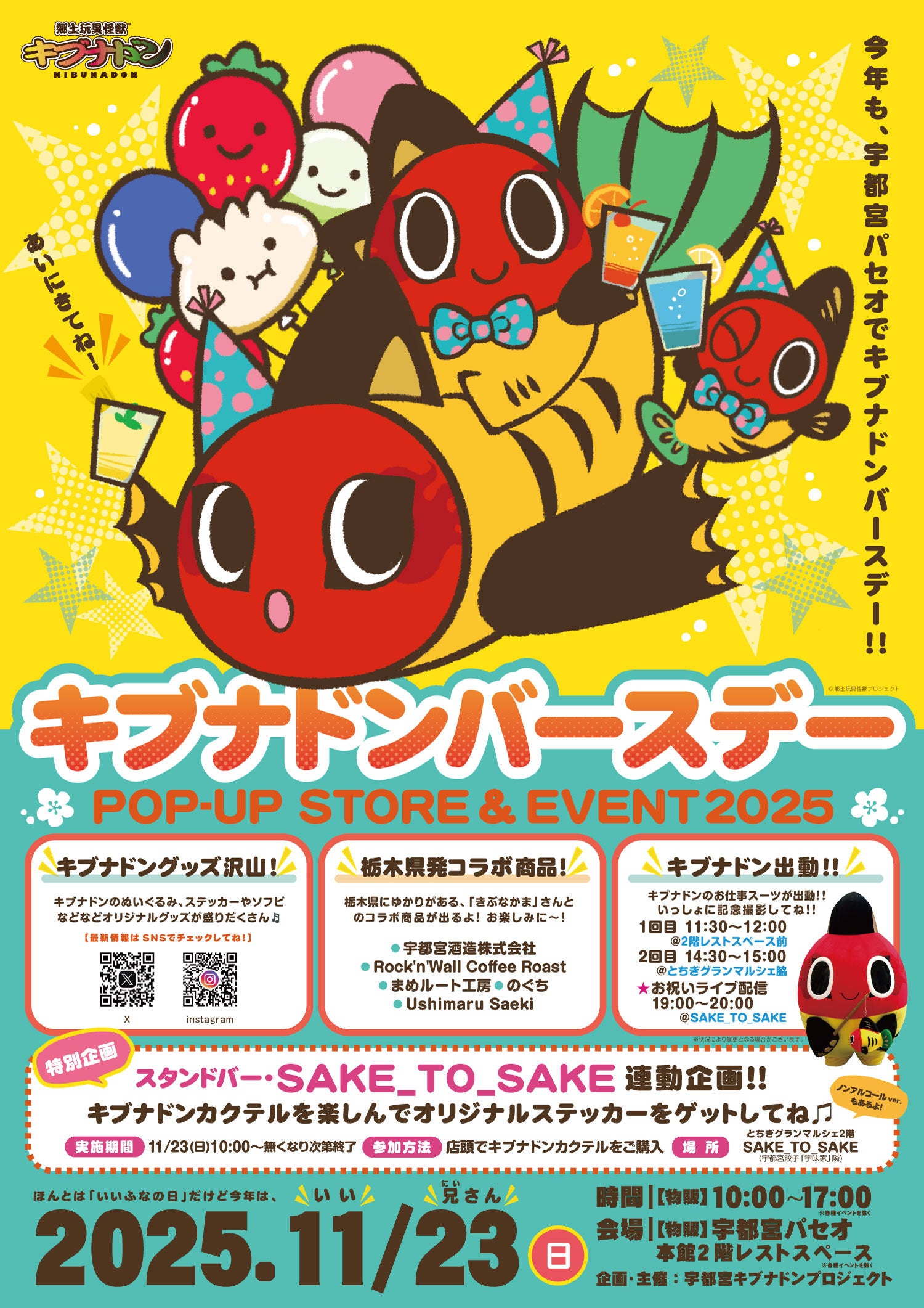 こんにちは☆黄ぶなが大好き”きぶなかま”お知らせ担当です!キブナドンの故郷、栃木県宇都宮市では、猛暑日が多かった夏もいつの間にか過ぎ、日毎に秋の深まりを感じる様になりました。先月はジャパンカップサイクルロードレースや、全日本吹奏楽コンクールなどが開催され、駅や街中に活気が溢れていましたよ♪さて、今年もこの季節がやってきました!「きぶなかま」のみなさまへ無病息災ぱわー!をお届けするべく、UKP(宇都宮キブナドンプロジェクト)よりイベント開催のお知らせです♪11月27日は、いい(11)フナ(27)で、宇都宮の"良いフナ"黄ぶなの怪獣・キブナドンの誕生日!! その誕生日に最も近い日曜日、今年は11月23日、”いい(11)兄さん(23)の日”に「キブナドンバースデーイベント」を開催いたします!!また1年、故郷で応援活動に励んだキブナドンのあゆみや、ぱわーアップした姿を皆様へお届けできたらと思っております。今年もJR宇都宮駅直結の宇都宮パセオにて開催させていただきます♪どなた様でもご参加大歓迎です! 今年は11/23(日)開催!【キブナドンバースデー POP-UP STORE&EVENT 2025 】【日時】2025年11月23日(日) 10 : 00〜20 : 00 ◆POP-UP STORE出店 10 : 00〜17 : 00 @ 2階レストスペースステッカーやアクリルキーホルダー、ソフビトイなどキブナドンのグッズ販売、 他にもこの日発売予定の新商品がございますのでお楽しみに!◆コラボ商品いっぱい!キブナドンが宇都宮で活動をする中で出会った、栃木県にゆかりのある「きぶなかま」さんとのコラボ商品が出ます! 続報をお楽しみに♪<コラボパートナー様(順不同)>⚫︎宇都宮酒造株式会社⚫︎Rock'n'Wall Coffee Roast⚫︎まめルート工房(まめた・マルート)●デザイナー・のぐち●Ushimaru Saekiその他、グッズについての最新情報は、キブナドンの各SNSアカウント(X、Instagram、Facebook)より追って発信いたします♪◆キブナドン出動!(グリーティング)もちろんお仕事スーツも出動します! ぜひいっしょにお祝いの記念撮影をしてくださいね♪★お仕事スーツ出動時間★①11:30〜12:00 @ 2階レストスペース前(昨年と同じ場所です♪)②14:30〜15:00 @ とちぎグランマルシェ脇(チーズガーデンさん外側付近です。)③19 : 00~ @ SAKE_TO_SAKE POP-UP SHOP(ライブ配信中に出動します。)※出動時間は変更となる場合があります。詳細は会場のUKPスタッフにお声がけください。◆UKP「キブナドンお誕生日記念」お祝いライブ配信 @ SAKE _TO _SAKE POP-UP SHOP (19:00~20:00会場で観覧OK!)お馴染みUKPメンバーによるライブ配信です! 今年はメンバーえりこママ企画のスタンドバー「SAKE _TO _SAKE POP-UP SHOP」にて、わいわいと宇都宮からイベントレポートをお届けいたします!※観覧ご希望のお客様は、ワンオーダーをお願いいたします。◆SAKE _TO _SAKE 連動企画開催!(10 : 00〜無くなり次第終了)お祝いライブ配信会場の「SAKE _TO _SAKE POP-UP SHOP」店頭にて「キブナドンカクテル」(アルコールver.(テキーラベース)600円、ノンアルコール500円) をご注文くださったお客様へ先着でオリジナルステッカーをプレゼント♪場所は「とちぎグランマルシェ2階 "宇味家” 横」です☆当日はスタンドバーで休憩しながら是非、宇都宮パセオさんでお買い物を楽しんでくださいね☆【会場】宇都宮パセオ 本館2階 レストスペース※レストスペースの物販は17時までとなります。 (〒321-0965 栃木県宇都宮市川向町1−23 )~アクセス~JR東北本線(宇都宮線)宇都宮駅の改札を出てまっすぐ、パセオ入り口からずっと奥まで進んでいただき、「八重洲ブックセンター」さんと「保険見直し本舗」さんの間が場所となります。駐車場に関しては宇都宮パセオ「アクセス」ページをご覧ください。今年もキブナドンの実家「田川」のすぐ近くでお祝いイベントをぱわー! いっぱいに開催いたします☆どうぞお楽しみに♪( ★次回の「キブナドンバースデーイベントワクワク情報」につづく★ )------------------------------------------------------~カプセルトイ「VAG郷土玩具怪獣キブナドン第二弾」元気に稼働中!~<取扱店>★栃木県宇都宮市内★・宇都宮酒造※ 2025年11月現在、宇都宮酒造さんにのみVAGキブナドン第一弾、第二弾両方ございます!店舗様の定休日や在庫など、事前にご確認の上、足をお運びください♪問合せ先/http://www.prestage.co.jp/------------------------------------------------------↓キブナドンの最新情報は各SNSでご覧頂けます↓XFacebookInstagram