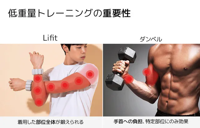 低重量のライフィットバンドは、手首や足首に負担を与えず、運動動作時に着用部位全体の筋肉を使います。