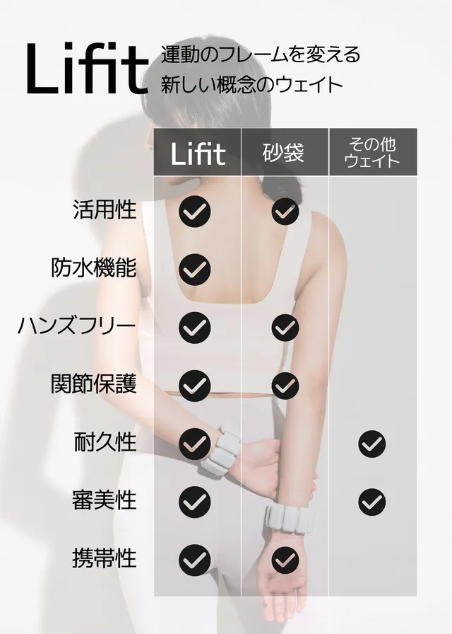 ライフィットは「LIFE + FIT」「LIFE + IT」の合成語で、80年代から使用されているウェイトの砂袋からモチーフを得た製品です。 砂袋は運動する時にも良いですし、日常生活に着用しているだけでも運動効果が得られる良い運動用品ですが、あまり活用されていません。