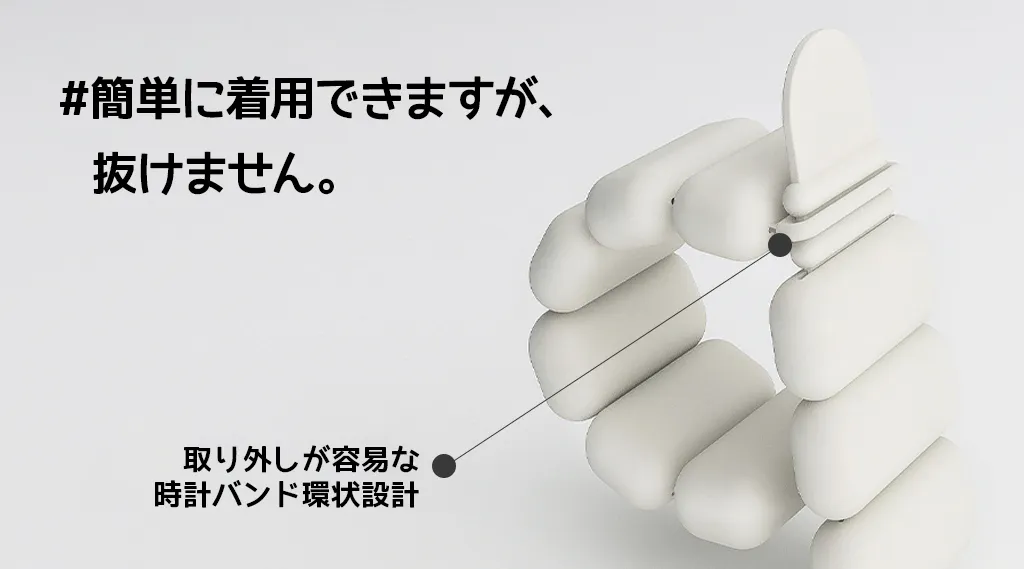 ライフィットバンドは、スマートウォッチのシリコンバンドに着目して設計されました。 シリコンバンドの先端にある輪に反対側のバンドをはめて着用するスタイルで、難しくなく誰でも簡単に着用することができます。
