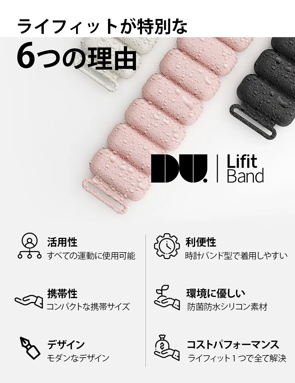 ライフィットバンドはデザイン性に優れ、運動時だけでなく通勤や日常生活でも気軽に着用できるメリットがあり、環境に優しいシリコン素材で製作され、運動時に発生する汗など水分が染み込まない防水機能と汚染時の手軽な洗浄で運動時に最適化された製品です。