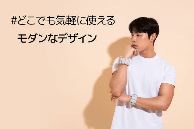 運動時だけでなく、日常生活で常に着用しても気にならないデザインに設計しました。 日常生活の時にも気軽に着用してください。運動を普段の生活の中に取り入れることで無理なく筋力を向上できます。