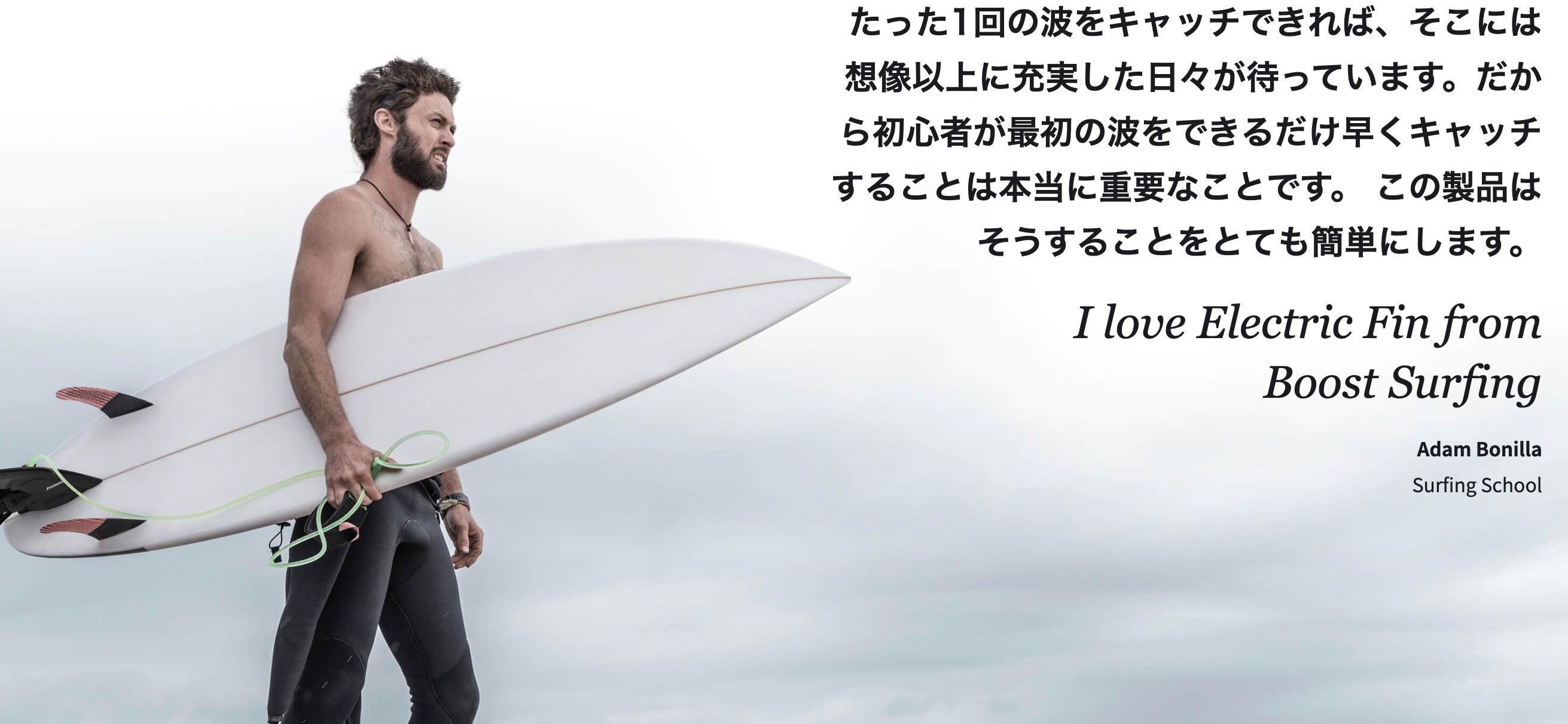 私たちは、LAに本社を構えるBoost Surf(ブーストサーフ)と申します。私たちが開発したブーストフィンは、全く新しいアクティビティ補助型の最新ガジェットです。もともとサーフィンはラインナップまでの長いパドリングや、波をキャッチする事の難しさが課題だと感じていました。そしてある時、CTOのアレックスが肩を負傷しました。彼が痛そうにサーフィンしている姿をみて、ブーストフィンの構想を思いついたのがそもそもの始まりでした。おかげさまで、kickstarter でお披露目してからというもの、大変多くの方々に反響をいただいているのを実感しております。