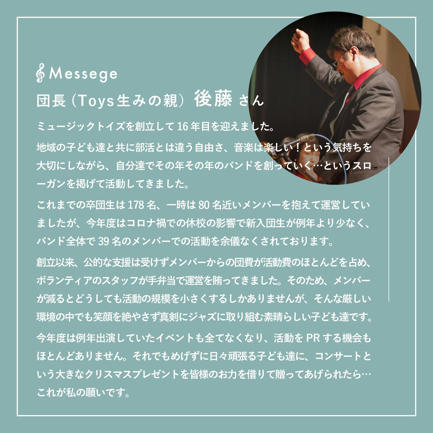 それでも、年末コンサートを今年も開催したい。地域の方々にも例年通り楽しんでいただきたい。そんな想いから、クラウドファンディングの実施を決めました。大きなお金を皆様からご支援いただくことになりますが、会場に足を運べない方にもコンサートを楽しんでいただけるようなリターンをご用意しています。前よりももっとパワーアップしているトイズを、ぜひ会場やご自宅で観て・聴いて頂きたいです!!