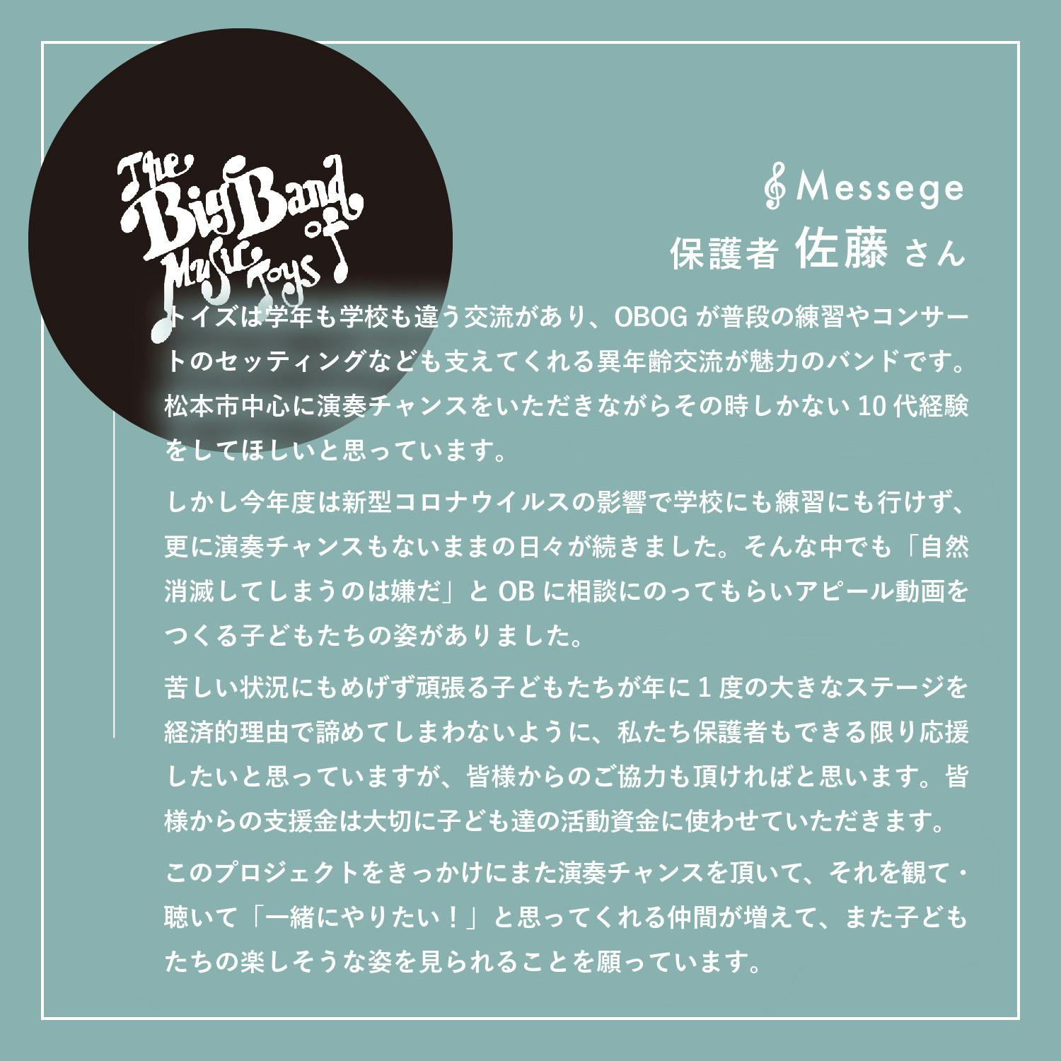 ここまでページを読んでいただき、ありがとうございました!最後になりますが、団員を代表してバンドマスターの赤津より、皆様への支援のお願いになります。