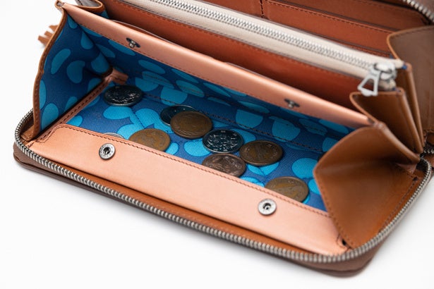 開口部分を大きくして小銭を見やすく、取り出しやすくしました。1st.モデルはフラットにしていたのですが、モニターの方から”ペタッとして小銭が取りにくい”と指摘されペフ芯を入れキルティング加工しました。その芯も使っていると潰れてきてしまったので、今回から潰れにくいウレタン芯に変更しています。