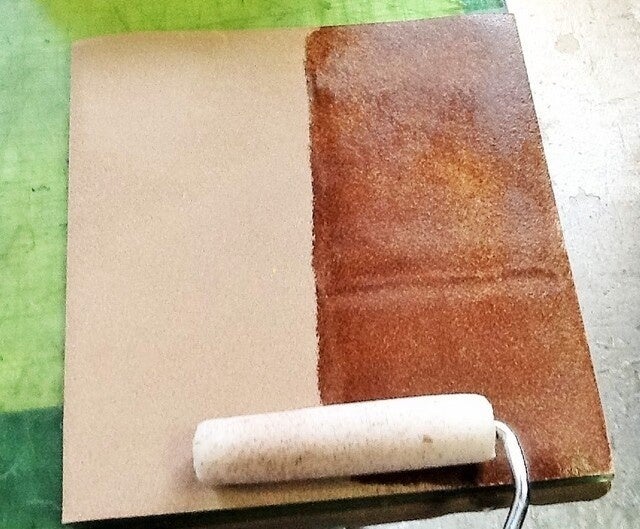 1.革の裏処理工程です。昔は職人が海藻(布海苔)を鍋で煮て作りましたが、現在はCMC( いわゆるセルロース系溶剤)を使っています。この工程で革の歪みを均一にならし、 接着剤が革の表面に滲むのを防ぐ非常に重要な工程です。