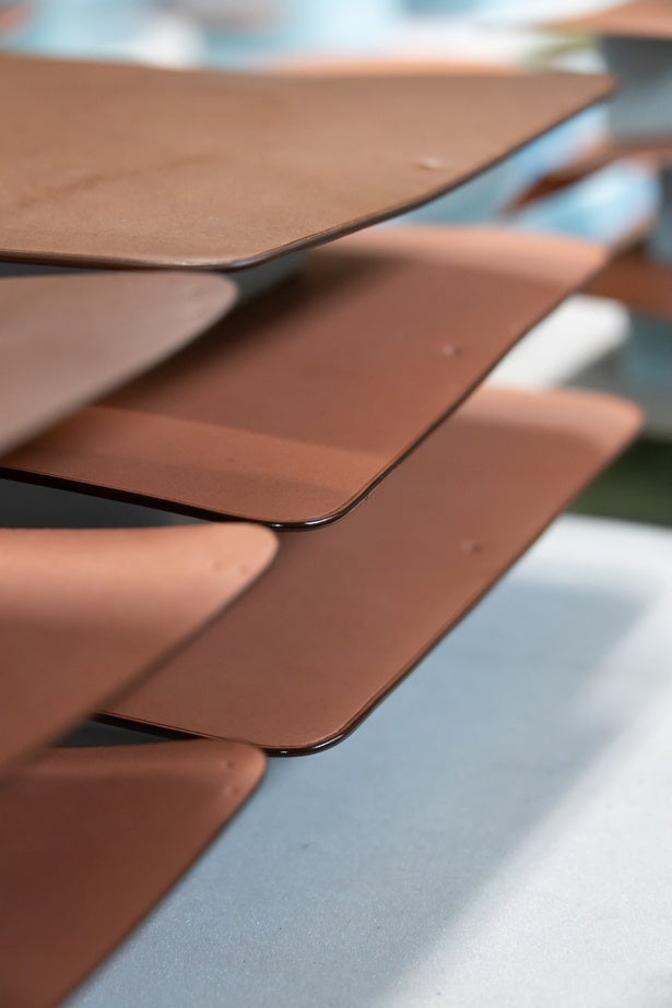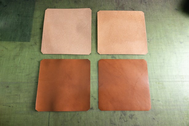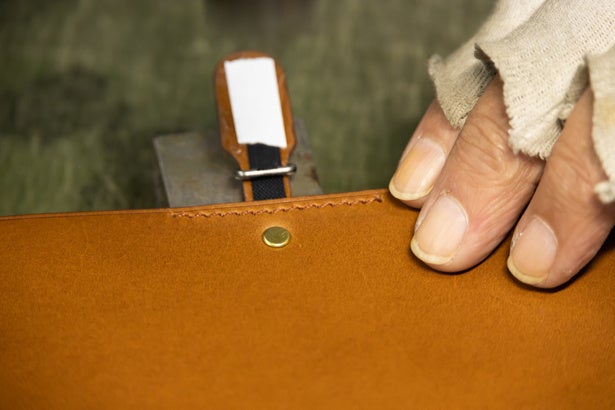 全パーツの革のコバ面は、すべて角を落としてから表面をなめらかに仕上げていきます。その後コバ用塗料を塗っては乾かして二度塗りし、最後に保護用のトップコートを塗布し、完全に乾いてから表面を手作業でバフ仕上げします。乾かしながらのこの作業だけでパーツごとに丸1日づつ掛かります。