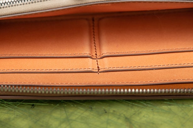 口の革切れを極力防ぐように、糸目の数を計算してステッチが掛けられています。
