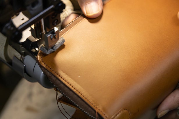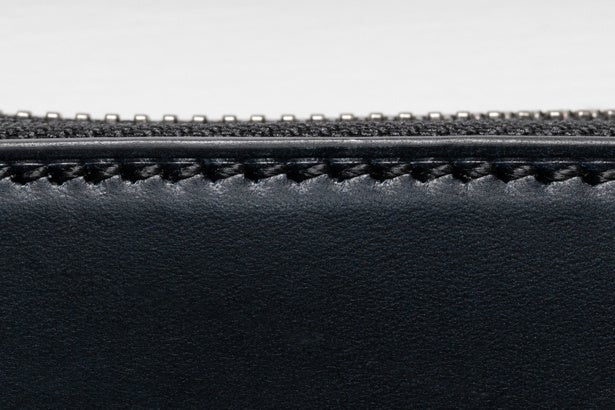 通常、革小物は20〜30番の糸を使用し丸針で縫われているためストレートな縫い目になっています。しかしこの商品は鞄で使われる5番という太い糸で、しかも菱針で縫われています。菱針で縫われた縫い目は斜めに入っていくため見た目が非常に美しくなります。ヨーロッパの高級ブランドのバッグも全て菱針で縫製されています。本来鞄職人である惣次郎の真骨頂です。