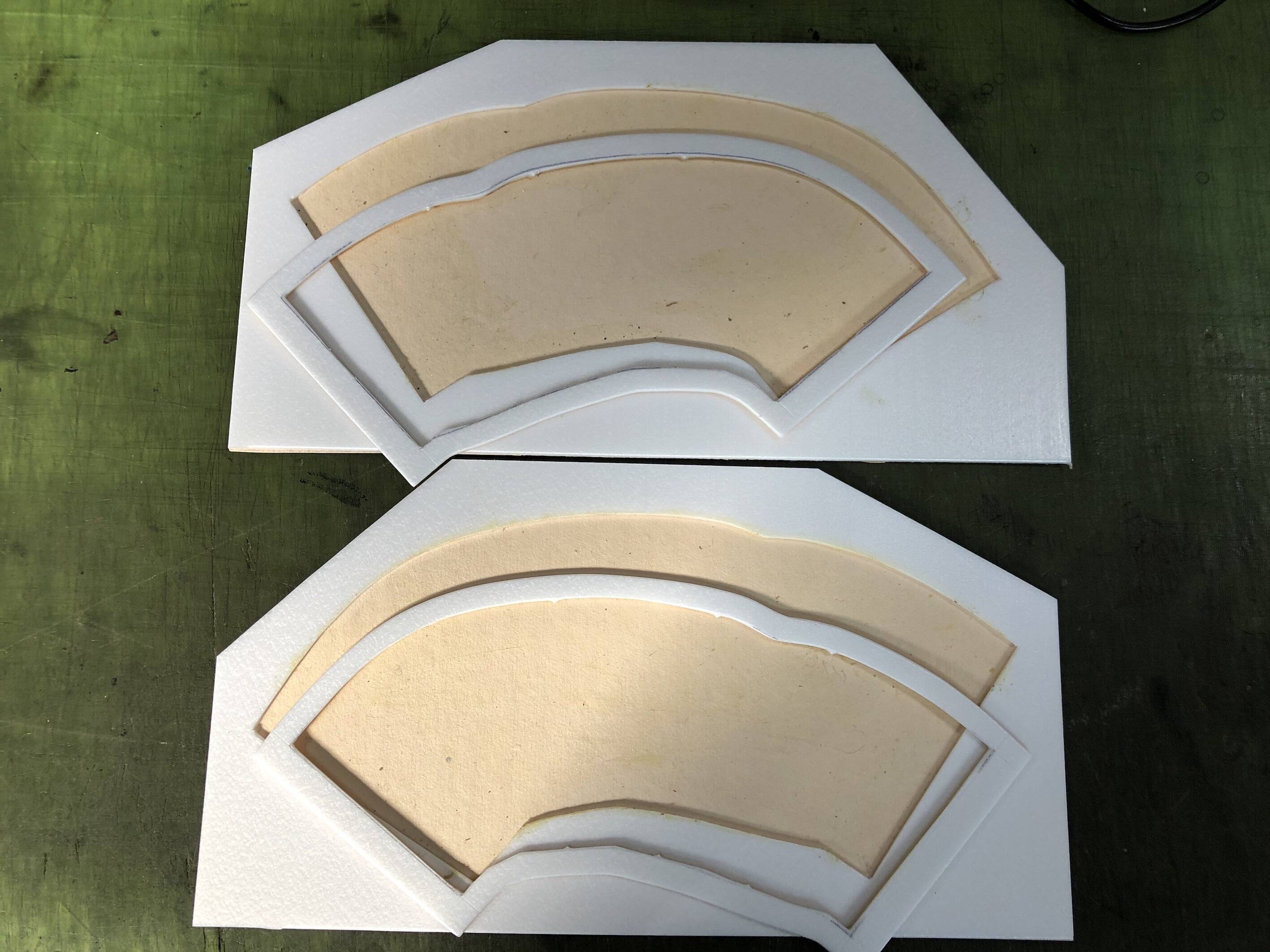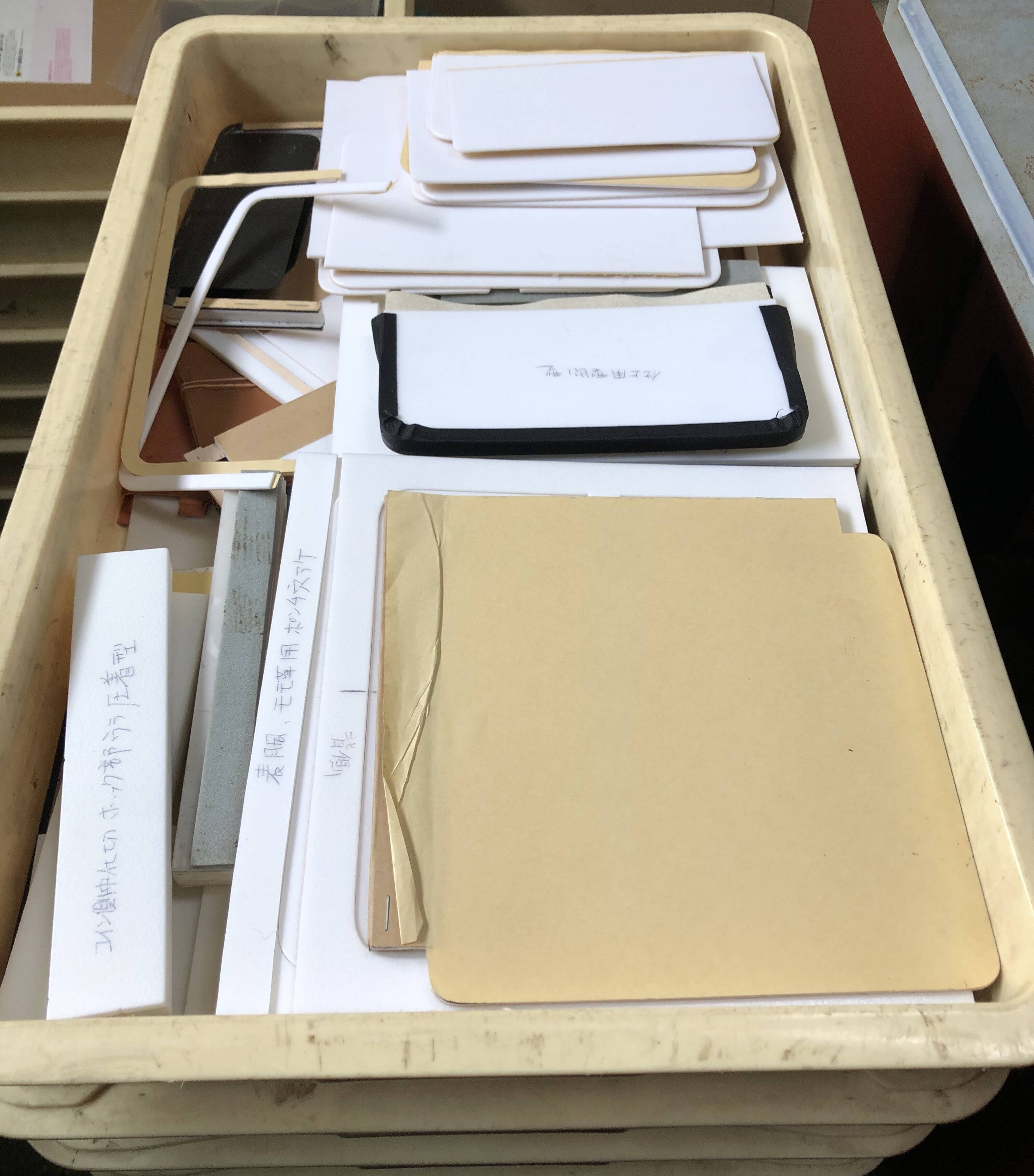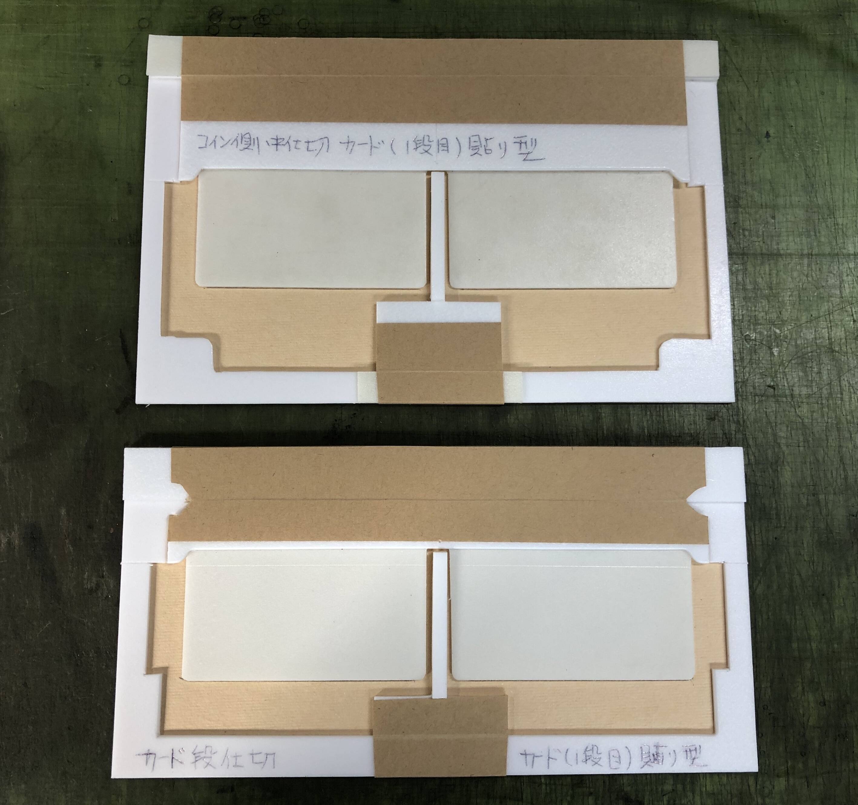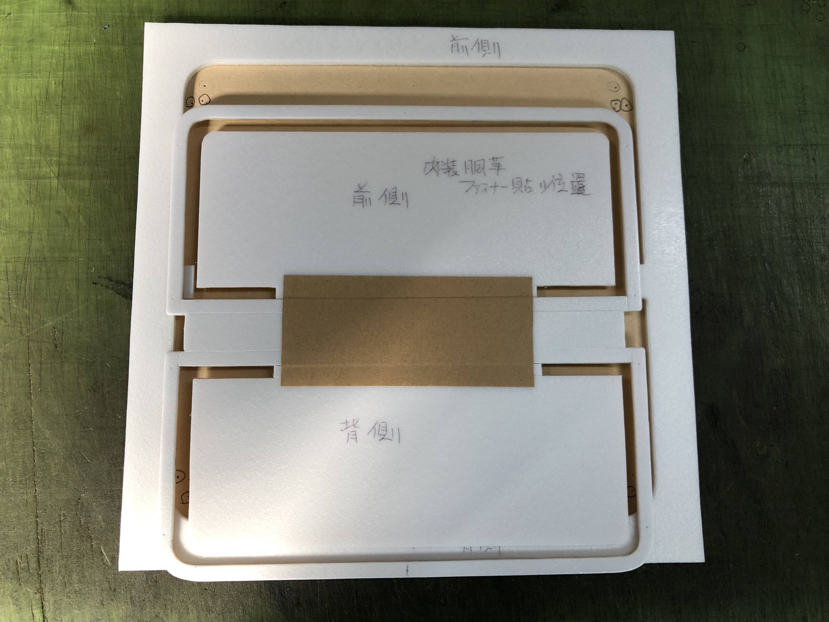 下3枚の写真は、正確に裏地や革を貼り合わせるための治具です。