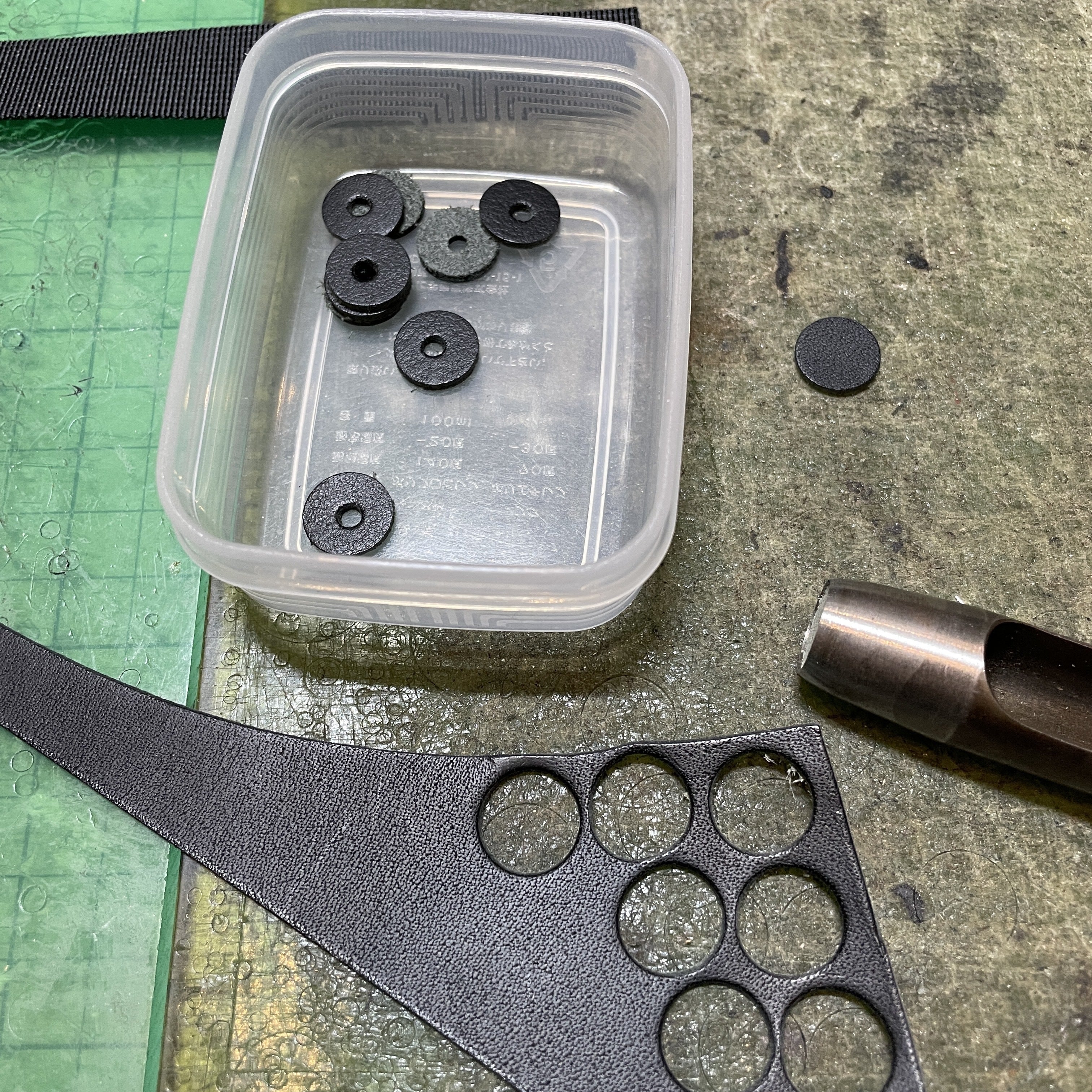 この革ボタンと革紐は、革を裁断した後に捨てられる端材を自ら裁断して作っています。ボタンの裏側やゴム紐のストッパーも革の端材をポンチで抜いて作っています。