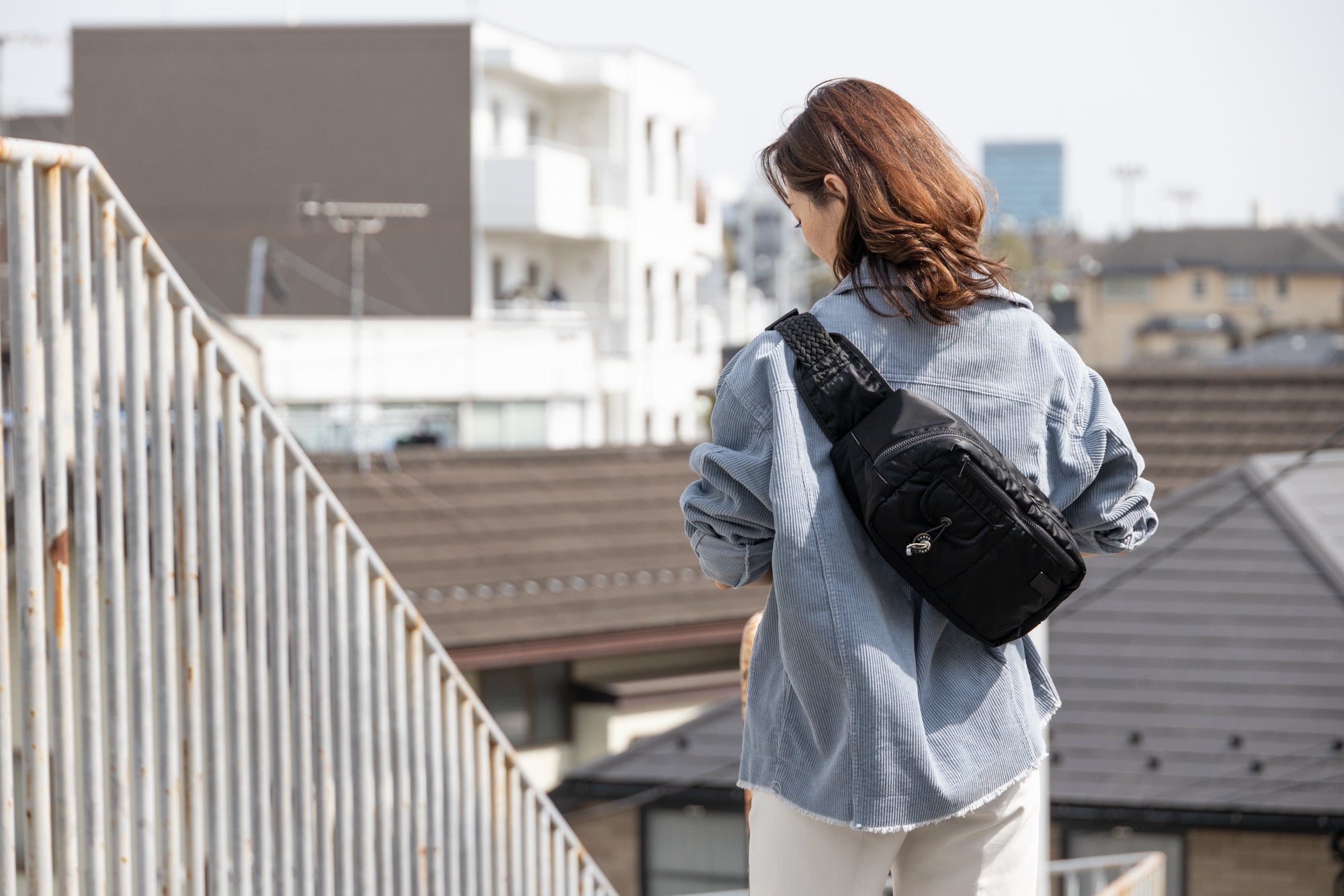 そして自分が使いたくて、ちょっとした外出やバイクの移動に最低限のモノが入るバッグをデザインして作ったのがこのスリングバッグです!
