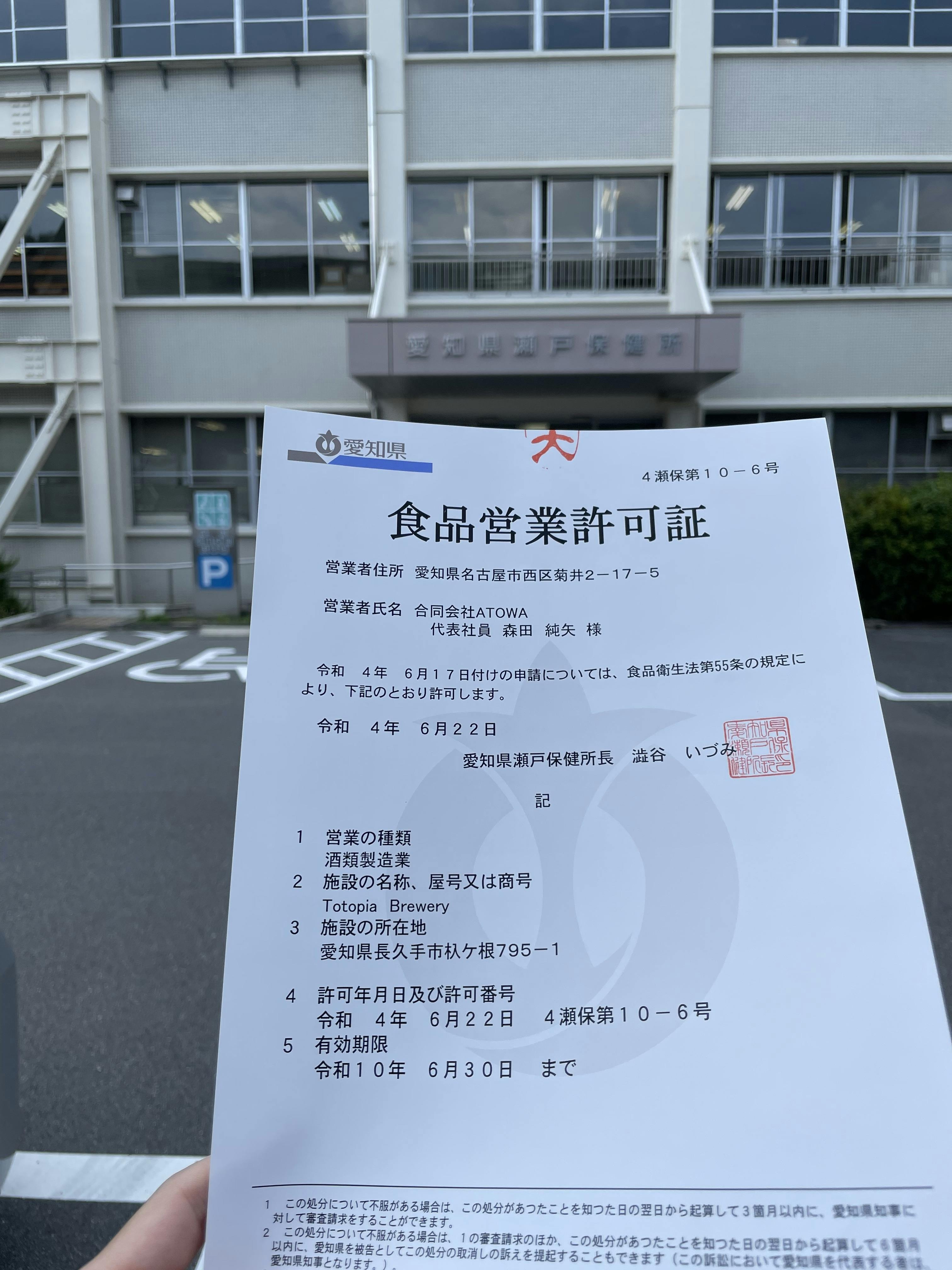 先日、瀬戸保健所より酒類製造許可を頂きました。